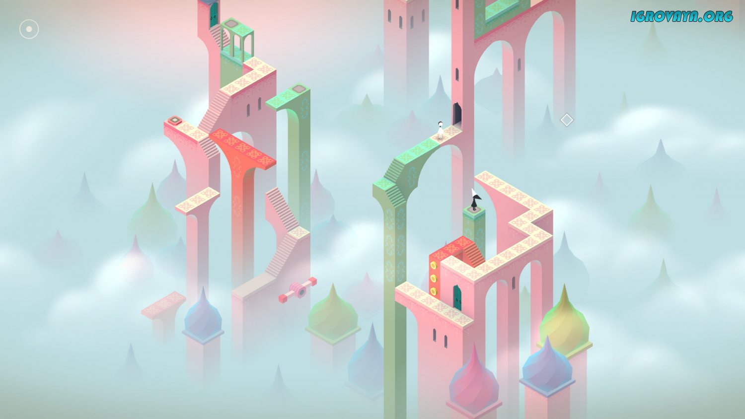 Геймплей Monument Valley крайне занятен и затягивает с первых минут запуска. Игроки оказываются на уровне с причудливыми постройками и вам необходимо менять их вид. Поворачивайте доступные элементы, трансформируя их и придавая необычные формы, а после попытайтесь провести через восстановленные развалины персонажа. Кликайте на место, куда Ида должна пойти, а после вместе с ней передвиньте элемент, перемещая объекты в пространстве. Иногда придется взаимодействовать с некоторыми предметами, которые запускают простые механизмы в действие. Приятные и ненавязчивые саундтреки вместе с звуковыми эффектами позволяют погрузиться в процесс и дополняют ваше путешествие.
