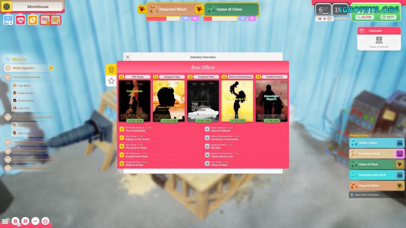 Наблюдайте за конкурентами, не забывая, что у них можно многому научиться. Анализируйте их успехи и провалы, стараясь привносить изменения в свою работу. Может, стоит обновить персонал или вложиться в их развитие? Или сменить жанр и поэкспериментировать с артхаусным кино? Никто не знает наверняка, что из этого получится, и от этого только интереснее. У нас вы можете скачать Moviehouse – The Film Studio Tycoon торрент последнюю версию бесплатно на компьютер.