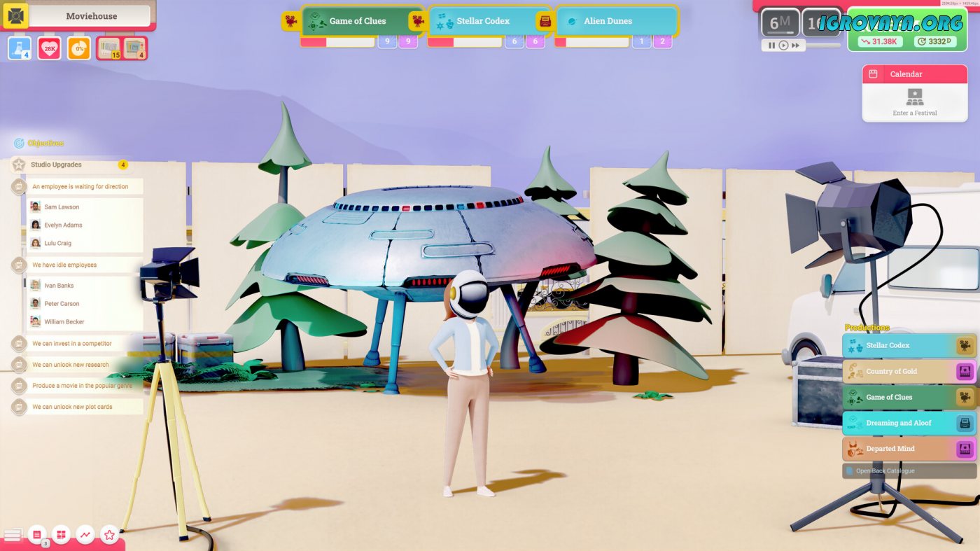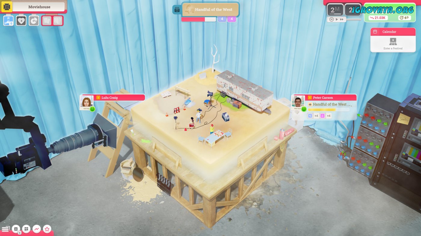 Игровой процесс Moviehouse приятно удивляет разнообразием и насыщенностью. Все ключевые события происходят на импровизированной студии, состоящей из сцены, трейлера и места для обеда. Нанимайте героев и управляйте ими, приобретая необходимые для съемки фильма элементы. Начните с оборудования и оформления кадра, а также позаботьтесь об еде и напитках, ведь работникам нужно восполнить запас сил перед началом сложного проекта.