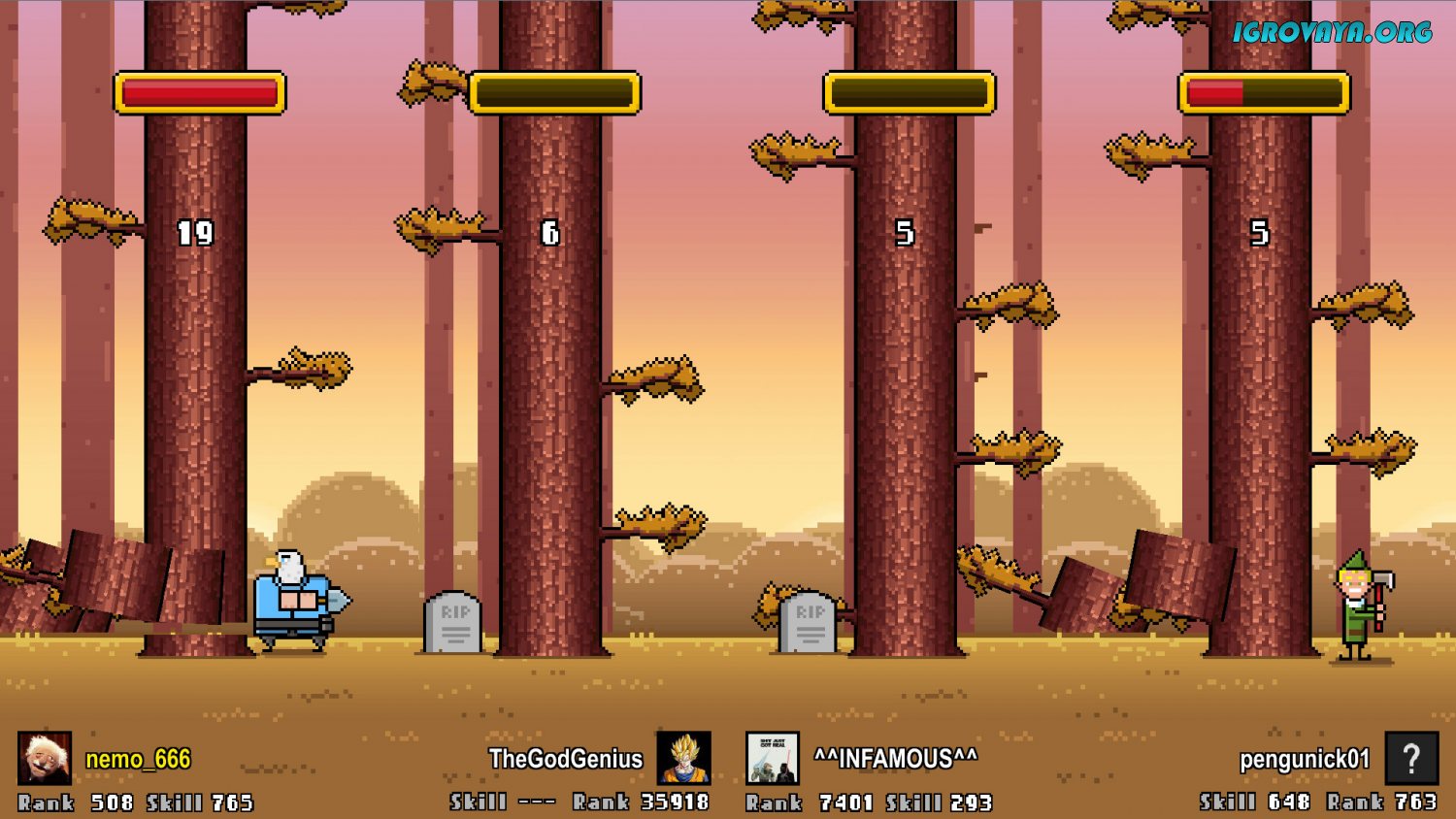 Сражайтесь против себя, оттачивая мастерство в одиночной игре, или соберитесь с друзьями и соревнуйтесь между собой. Устраивайте состязания группой до восьми человек и устройте битву за звание лучшего лесоруба королевства. Увеличивайте темп и обгоняйте соперников в попытке получить как можно больше баллов и забрать главный приз. У нас вы можете скачать Timberman торрент последнюю версию бесплатно на компьютер.