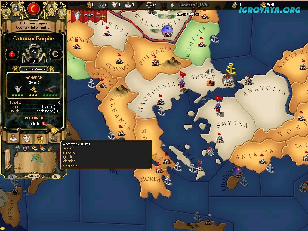 Развивайте внутреннее устройство государства и вкладывайте денежные средства в развитие науки и технологий, чтобы создать высокотехнологичную, по меркам того времени, страну, а также не забывайте про экономическое развитие, стараясь угодить гражданам и создать людям приемлемые условия для жизни и работы на этих землях. Защищаться от вражеских набегов также придется, но кроме действующих войск в ваших руках будет более могущественная сила в лице дипломатии. Налаживайте отношения с враждующими соседями, заключайте договора о перемирии или сотрудничестве и пытайтесь влиться в мировую экономику, чтобы обезопасить себя от вторжений. У нас вы можете скачать For The Glory: A Europa Universalis Game торрент последнюю версию бесплатно на компьютер.