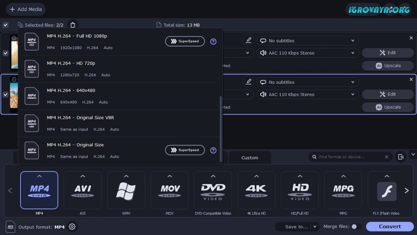 Movavi Video Converter — это программное обеспечение для конвертирования видео- и аудиофайлов различных форматов, а также упрощенному редактированию выбранных документов. Приложение позволит в несколько кликов изменить разрешение сторон, сжать изображение без потери качества, изменить битрейт или частоту кадров, добавляйте субтитры и это лишь небольшая часть доступных функций. Освойте простую программу и удобно храните различные файлы, чтобы те всегда были под рукой в необходимом разрешении.
