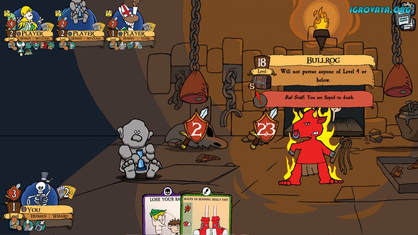 Геймплей, как и в оригинале, строится на построении колоды и собственного пути через опасные территории. Кликайте на дверь и получайте в ответ случайно сгенерированное событие, будь то встреча с могущественным боссом превосходящем вас по уровню, или же наткнетесь на затерянные сокровища. Параллельно с вами в игре принимают участие приглашенные друзья, которые также, как и вы, пытаются доказать силу в бою. Победу одержит тот, кому удастся прокачать игрового персонажа до десятого уровня, поэтому стоит поторопиться и не терять зря время. У нас вы можете скачать Munchkin Digital торрент последнюю версию бесплатно на компьютер.
