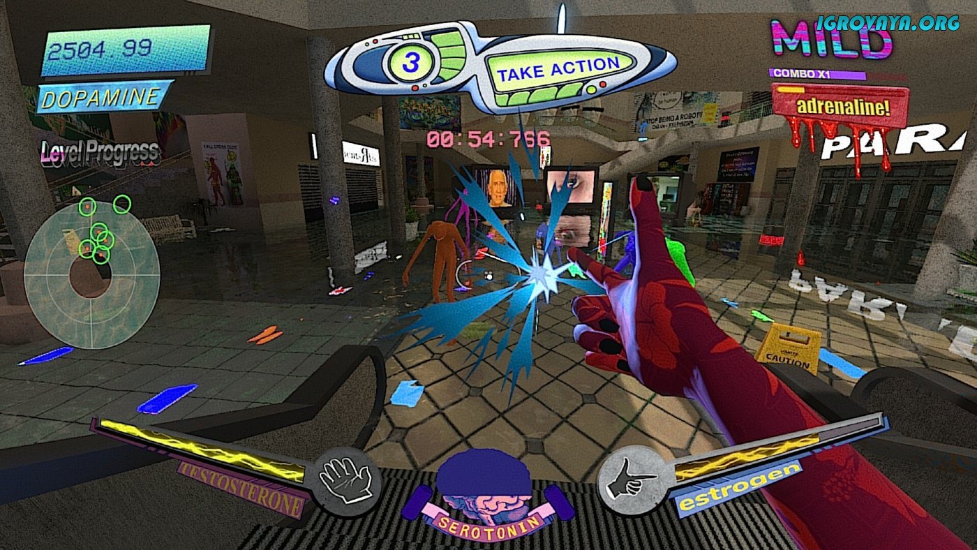 Продвигайтесь по причудливым оригинально выполненным уровням и продемонстрируйте свою мощь в битвах. Динамичная боевая система строится на умелом использовании имеющегося арсенала оружия и ловком перемещении по замкнутому пространству. Приготовьтесь уворачиваться от вражеских снарядов и быстро уклоняться от опасности, иначе шкала дофамина начнет стремительно уменьшаться, а вместе с ним и ваша скорость.