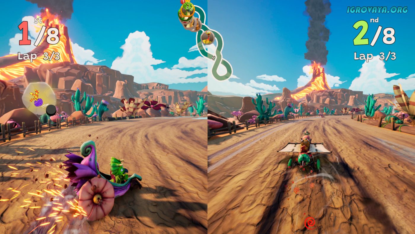 Мало кто знает, но в доисторические времена динозавры то и дело развлекали себя катанием на картингах и вас доведется присоединиться к огромным существам в этом увлекательном деле. Исследуйте удивительный мир Диногонок, ведь в нем вы найдете много интересных фактах о разных видах динозавров, а также примите участие в эпичных заездах на время. Gigantosaurus: Dino Kart отличилась своей простой и понятной механикой, которую освоят игроки любого возраста и возможностей, а специальные функции по типу автопилота позволят облегчить прохождение трудных участков для комфортного времяпрепровождения.
