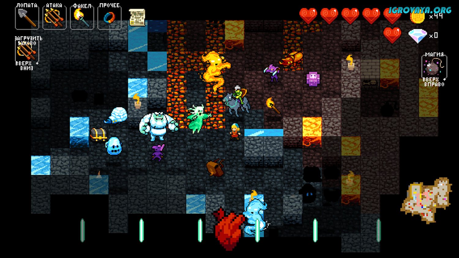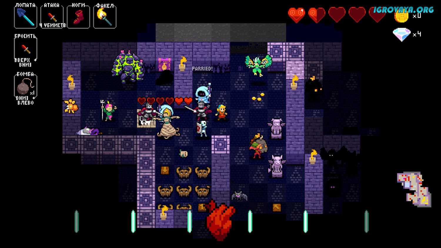 Главная же особенность Crypt of the NecroDancer, как вы уже наверняка поняли, заключается в передвижении и сражениях в ритм музыки, которая играет. Внизу экрана у вас будут мелькать пиктограммы, в ритм которых вам как раз-таки и придется двигаться – только двигаясь в ритм, вы сможете выжить и победить основную массу монстров.