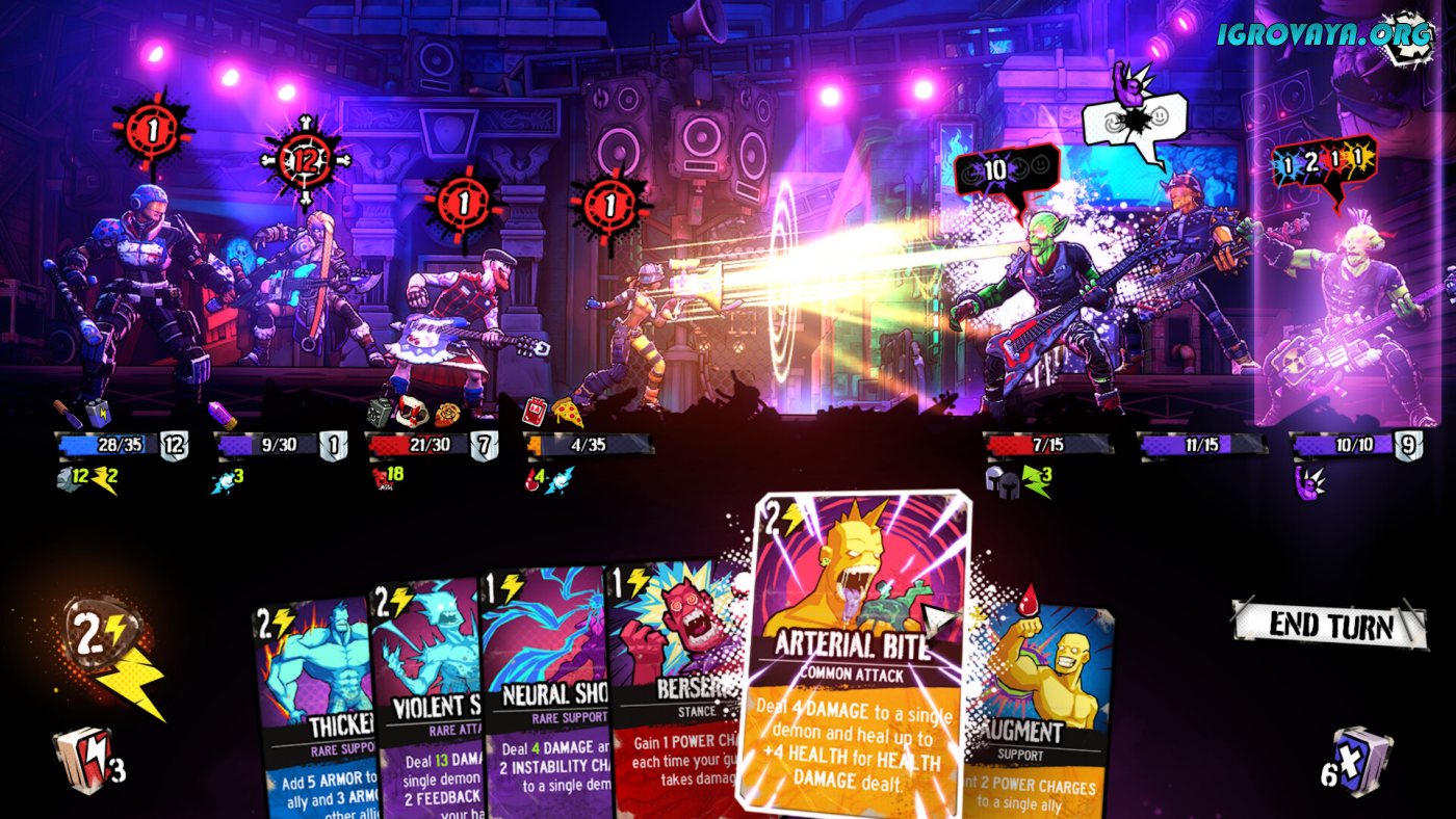 Регулярно просматривайте доступные карточки и собирайте колоду под каждого героя. Старайтесь с их помощью усилить прирожденные таланты персонажей, чтобы на поле боя иметь сильнейших бойцов. Докажите, что вам по плечу любые трудности, ведь уровень сложности постепенно будет увеличиваться преподнося вам новые сюрпризы. У нас вы можете скачать Power Chord торрент последнюю версию бесплатно на компьютер.