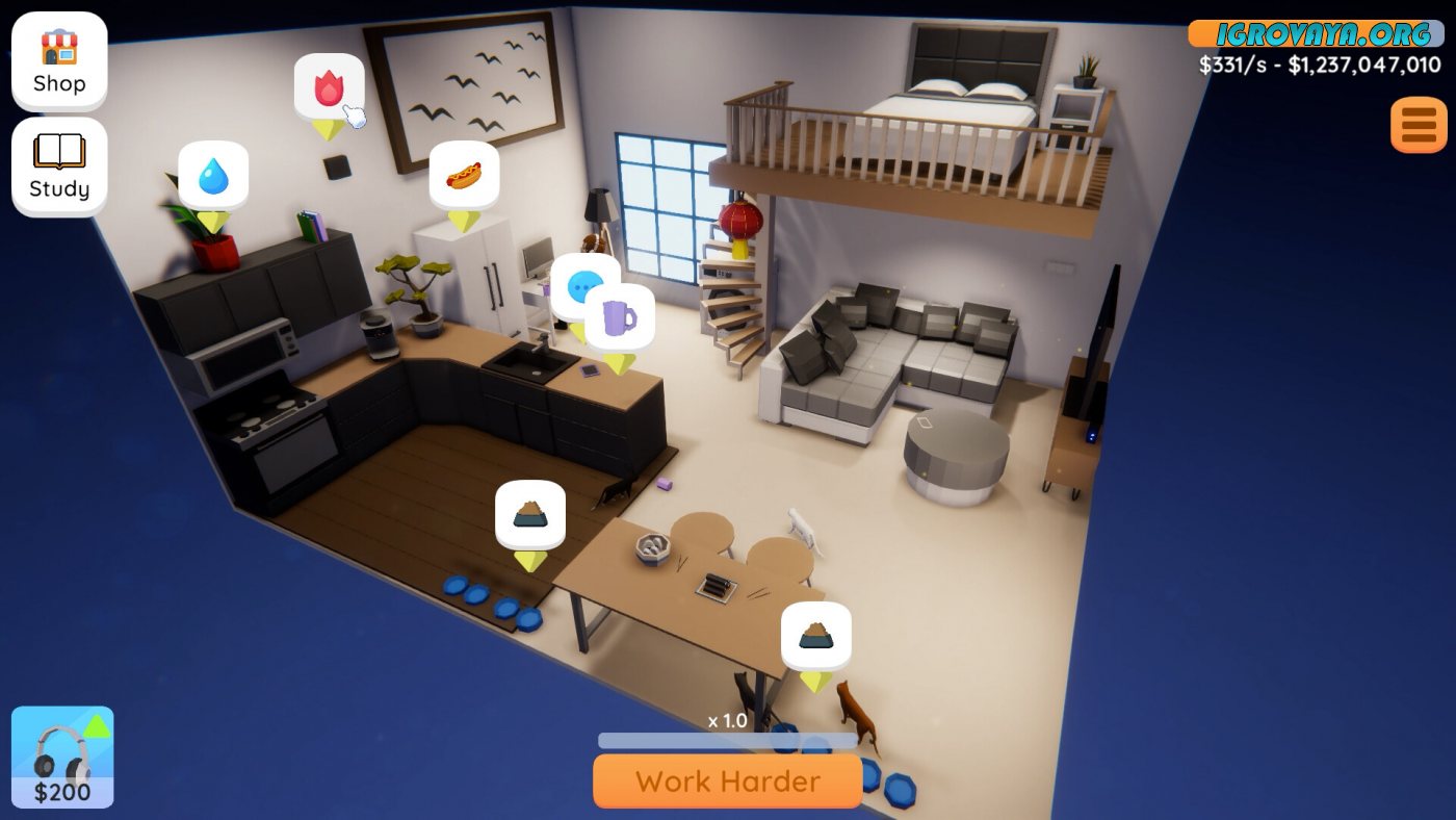 Затягивающий с первых минут игровой процесс не позволит оторваться и подарит игрокам максимум эмоций. Дело в том, что для управления в Home Office Simulator вам потребуется всего лишь мышка. Изучайте предложенную локацию и вовремя реагируйте на различные шумы и удовлетворяйте потребности пушистых любимцев, чтобы те не нарушали общий покой. Если на начальных уровнях сложность низкая и они направлены больше на то, чтобы новички влились в геймплей и ознакомились с основными механиками, то постепенно вам будут открываться все новые трудности. Впереди вас ждут целых семь квартир каждая из которых в разы больше предыдущей, а также обладает рядом уникальных особенностей.