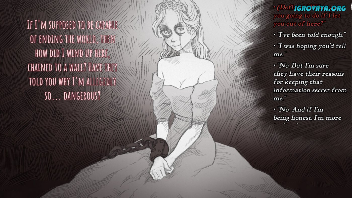 Slay the Princess — это оригинальная визуальная новелла в формате психологического хоррора, которое то и дело будет ставить игроков перед сложным выбором. В один день блуждая по лесу главный герой натыкается на едва заметную тропинку ведущую к старой хижине. Не в силах совладать со своим любопытством вы заглядываете во внутрь и в подвале обнаруживаете пропавшую принцессу, а таинственный голос нарратора говорит, что вы должны расправиться с ней, иначе весь мир ожидает конец света. Но девушка выглядит такой беззащитной, неужели она действительно представляет опасность? Вам предстоит узнать это и выяснить кто является наглым лжецом в данной ситуации.