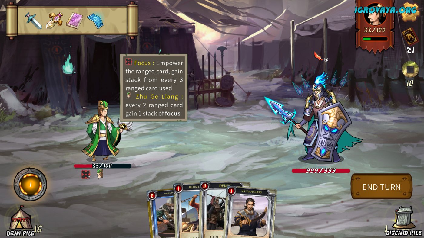 Three Kingdom: The Journey — это в меру сложная карточная стратегия с элементами рогалика, которая позволит совершить путешествие в прошлое и перенестись в Китай в период Троецарствия. Династия Хань переживает не лучшие времена, ведь королевство находится на пороге новой войны. Вам предстоит выступить в качестве мудрого полководца и собрать армию могучих воинов, которые не знают ни жалости, ни пощады. Отправляйтесь навстречу опасностям и взгляните в лицо смерти, а вместе с этим оттачивайте свое мастерство. Ловко расправляйтесь даже с самыми смертоносными врагами и заполучите вознаграждение в виде ценной карты, которая станет жемчужиной колоды.