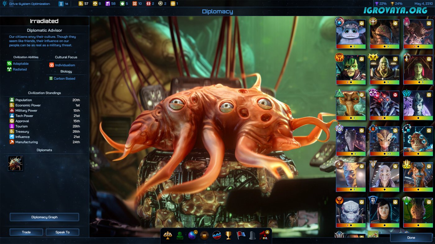 Galactic Civilizations IV: Supernova — это глобальная стратегия в формате 4Х, где перед вами открывается огромный простор для экспериментов за счет многогранной и проработанной вселенной. Перенеситесь в далекое будущее, а именно в начале XXIV века, когда человечество оказалось во главе всех космических цивилизации. Вам предстоит не просто возглавить ее, но и продумать вектор для его дальнейшего развития. Будете ли вы стоять во главе захватнической империи, которая планирует взять под свой контроль каждый отдельный уголок, или же создадите мир в основе которого лежит проработанные дипломатические отношения.