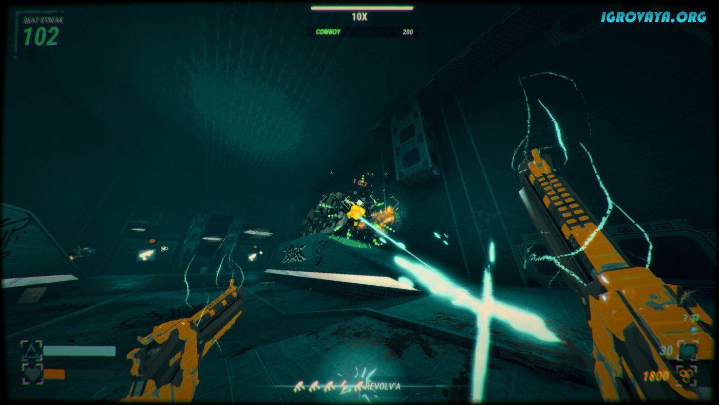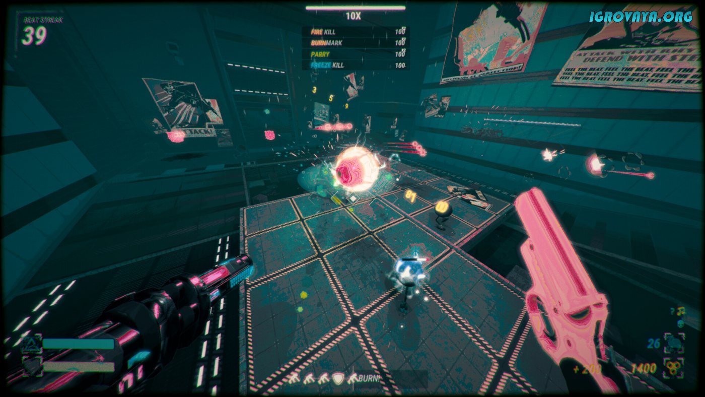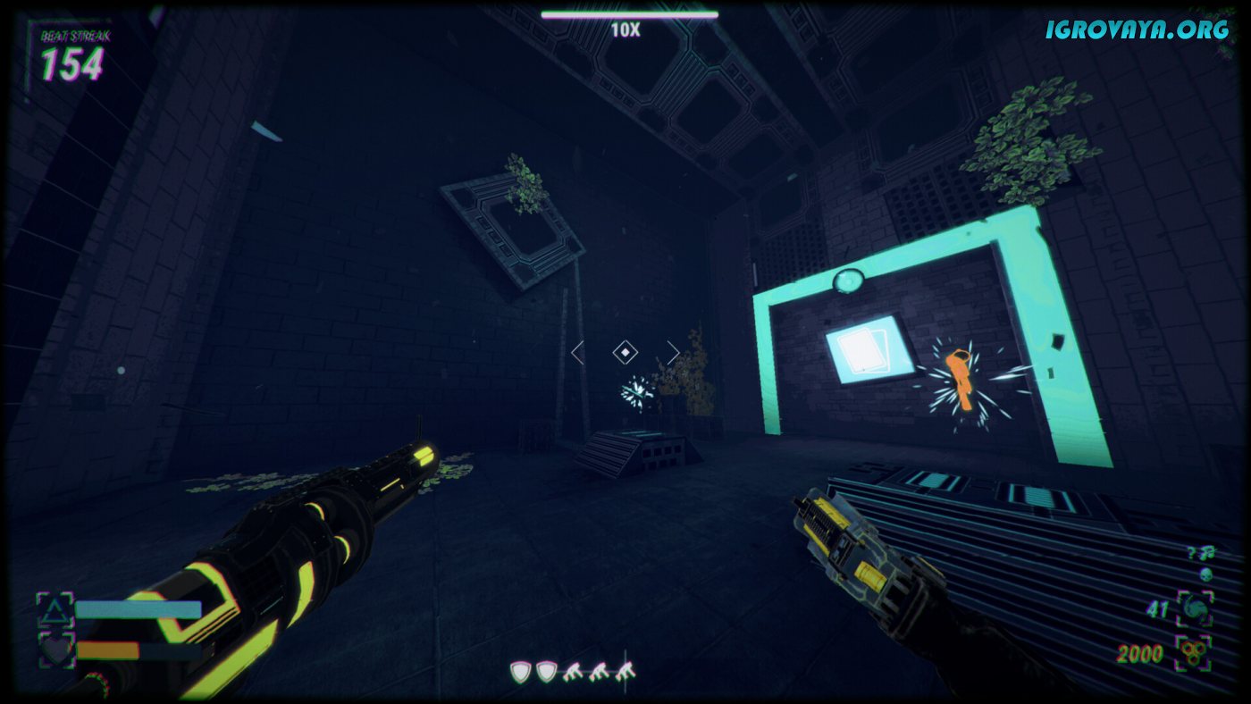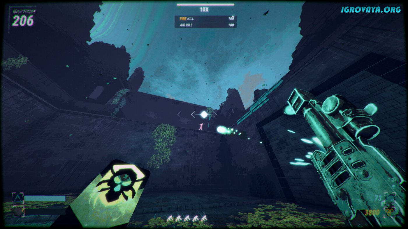 Бои тут особенные – если попадёте в ритм музыки, удары будут сильнее, а оружие быстрее перезарядится. У вас есть пистолеты, дробовики, даже ракетницы, и всё это можно улучшать, находя бонусы на уровнях. Ещё можно загружать свои песни – просто кидаете трек в игру, и она сама подстраивает ритм под него, чтобы вы стреляли в такт любимой мелодии. Карты меняются каждый раз – то узкие залы с ловушками, то открытые площадки, где можно прыгать и кружить врагов. Враги тоже не стоят на месте – одни летают, другие бьют вблизи, и надо всё время быть начеку.