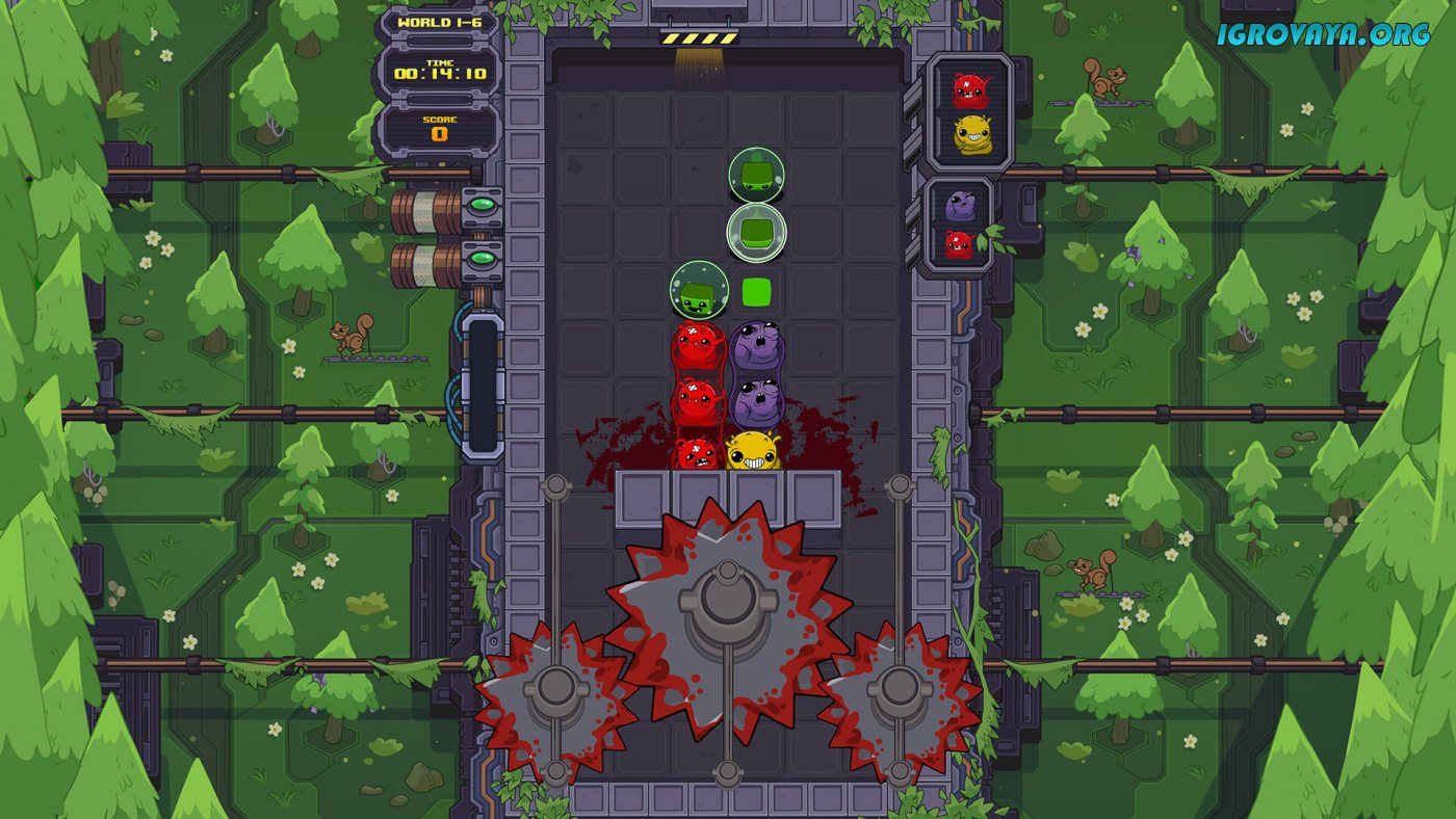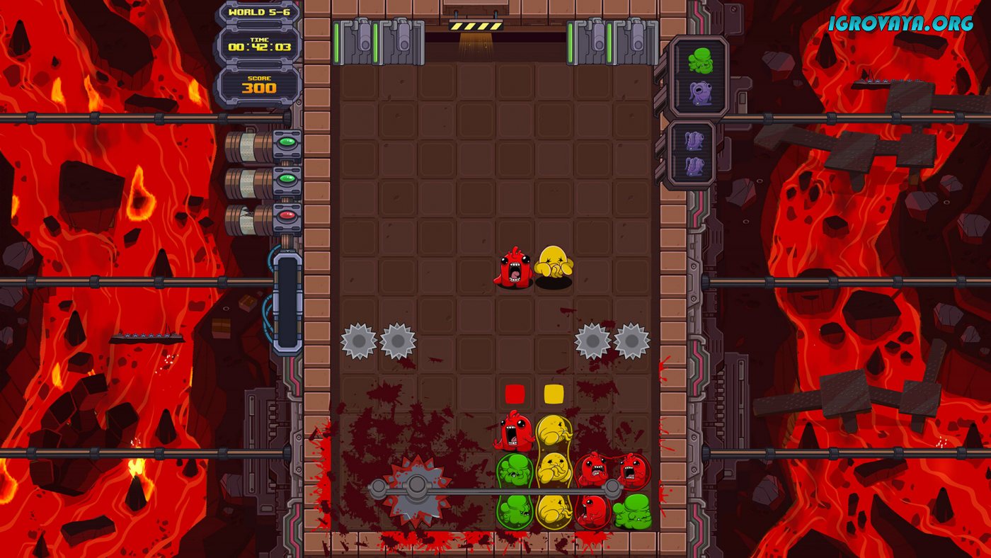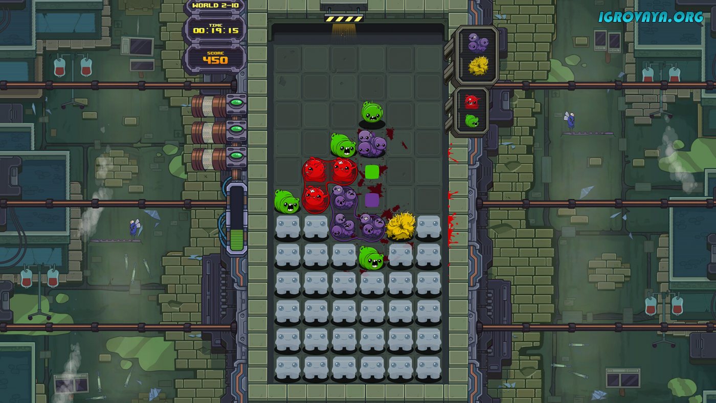 Всего в игре представлено сто вручную созданных уровней и с каждым разом они будут подбрасывать все новые испытания. Сверху вниз будут падать разноцветные блоки и вам предстоит располагать их таким образом, чтобы уничтожать одинаковые цвета, но не все так просто, ведь на пути блоки будут ожидать циркулярные пилы, пресс и прочие опасности. Ловко избегайте столкновения с колющими и режущими предметами и уничтожьте все блоки, чтобы приступить к следующему заданию. У нас вы можете скачать Dr. Fetus Mean Meat Machine торрент последнюю версию бесплатно на компьютер.