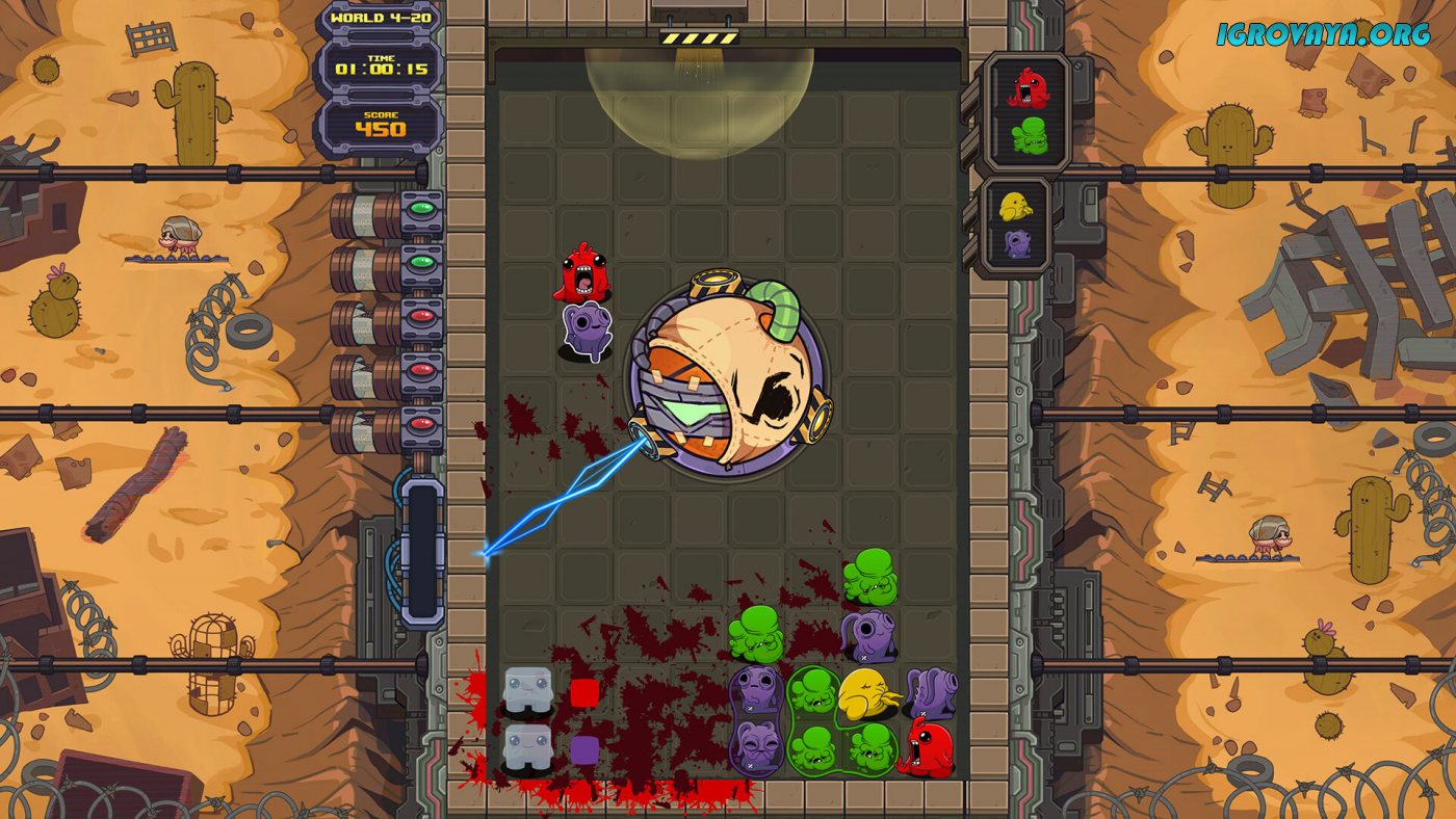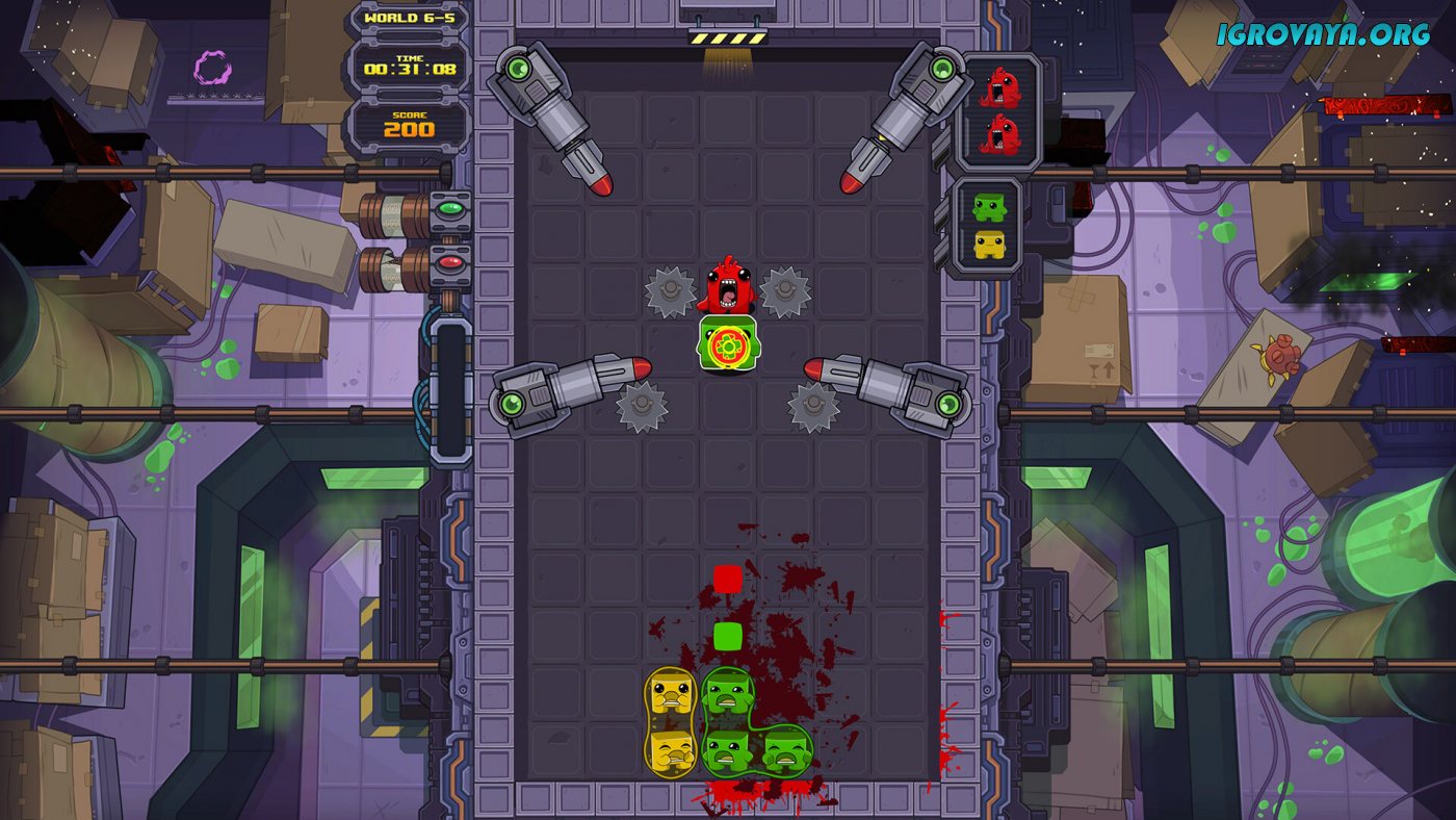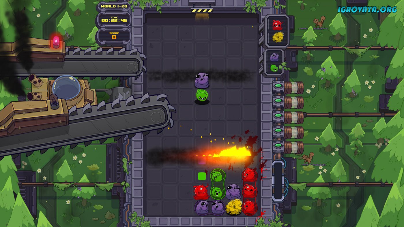 Всего в игре представлено сто вручную созданных уровней и с каждым разом они будут подбрасывать все новые испытания. Сверху вниз будут падать разноцветные блоки и вам предстоит располагать их таким образом, чтобы уничтожать одинаковые цвета, но не все так просто, ведь на пути блоки будут ожидать циркулярные пилы, пресс и прочие опасности. Ловко избегайте столкновения с колющими и режущими предметами и уничтожьте все блоки, чтобы приступить к следующему заданию. У нас вы можете скачать Dr. Fetus Mean Meat Machine торрент последнюю версию бесплатно на компьютер.