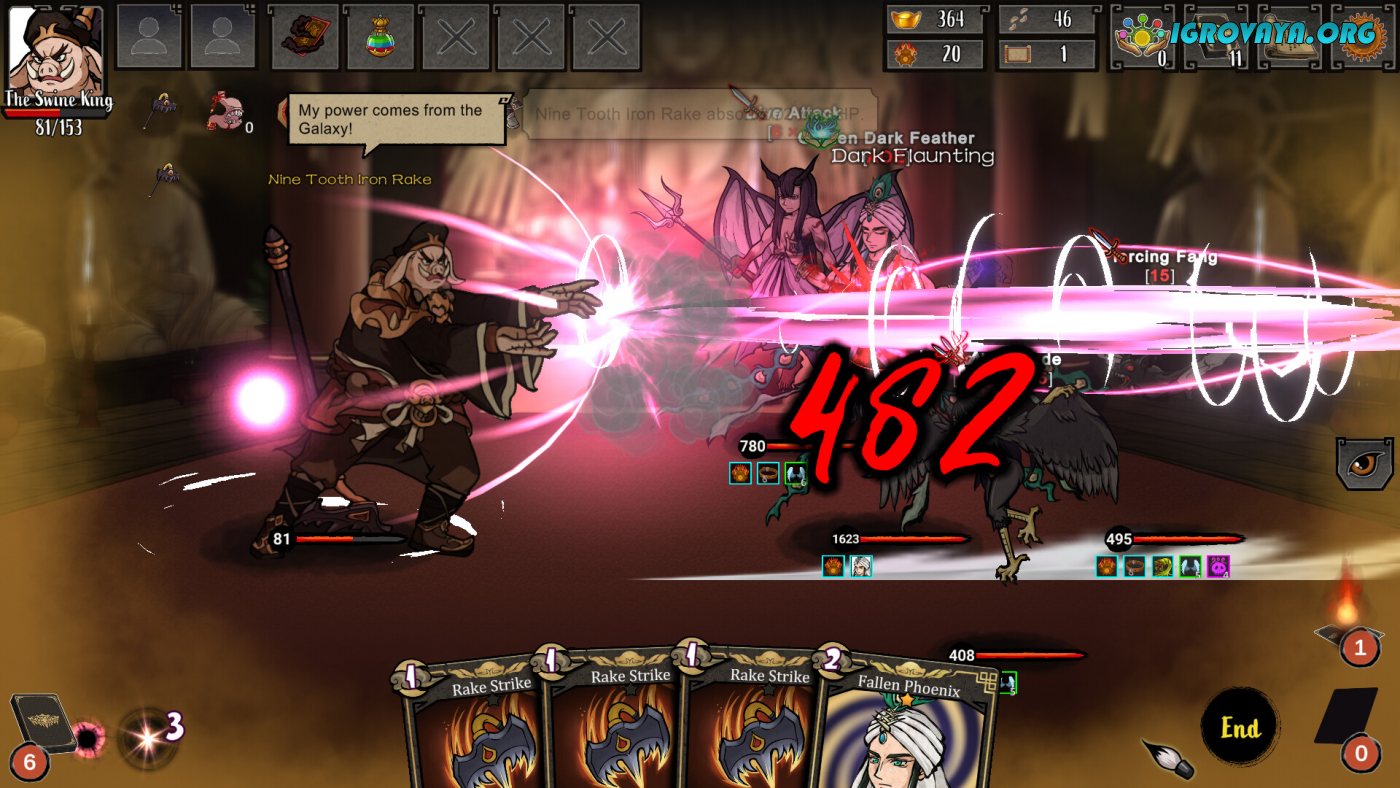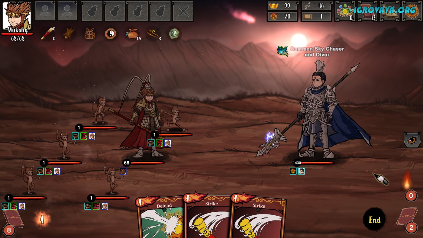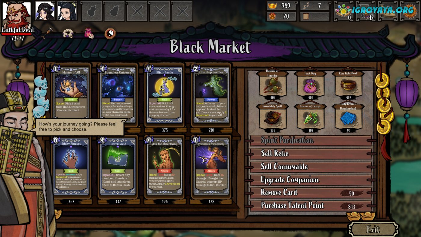 Сражения здесь — это сложные тактические головоломки, где помимо карт нужно учитывать позиции союзников, слабости противников и эффекты окружения. Набирайте команду из 20+ спутников, чьи способности дополнят вашу стратегию: одни усиливают атаки, другие лечат, а третьи и вовсе могут переманивать врагов на свою сторону. Особый шарм придает система реликвий — от свитка с печатью Будды до волшебного тыквенного сосуда, которые радикально меняют игровой процесс.