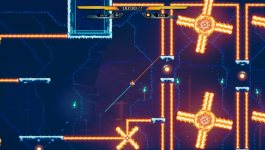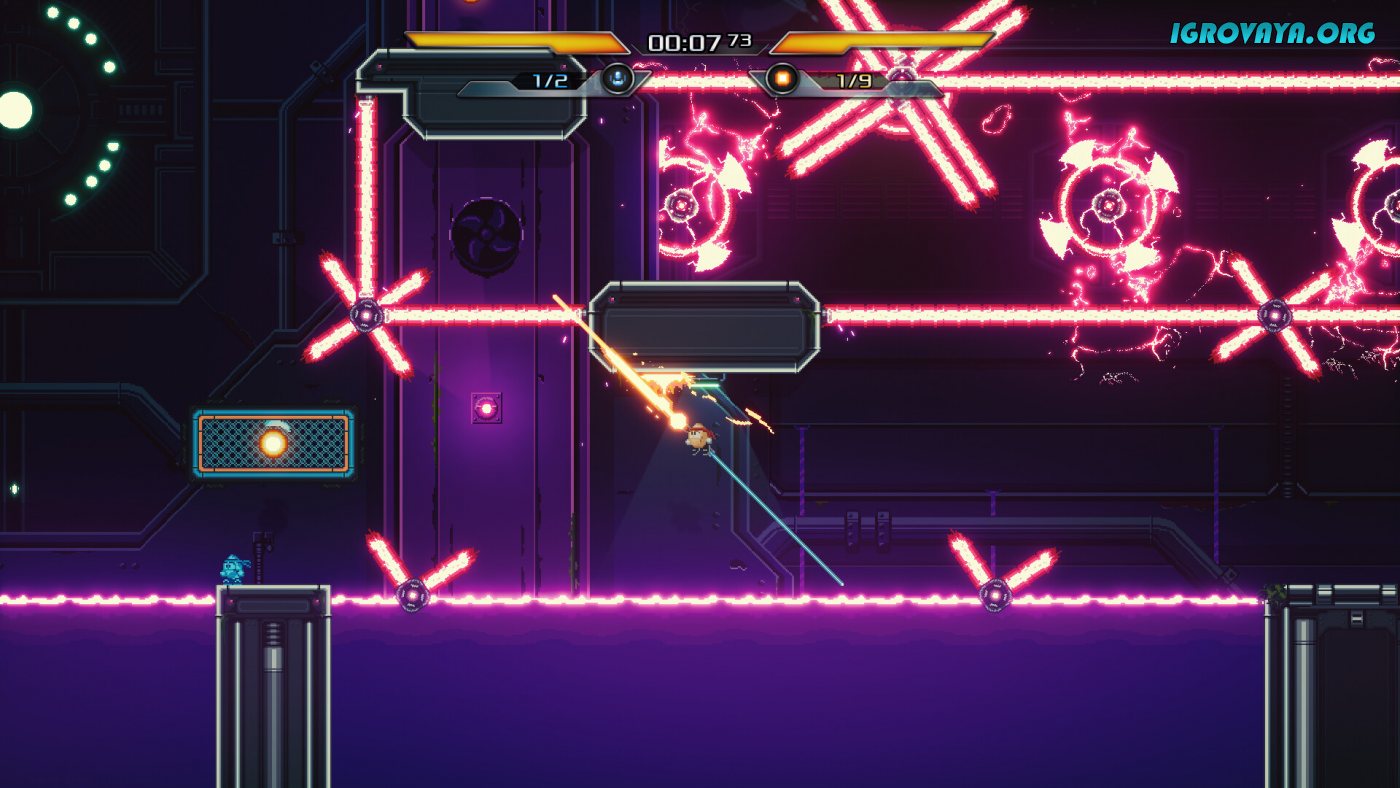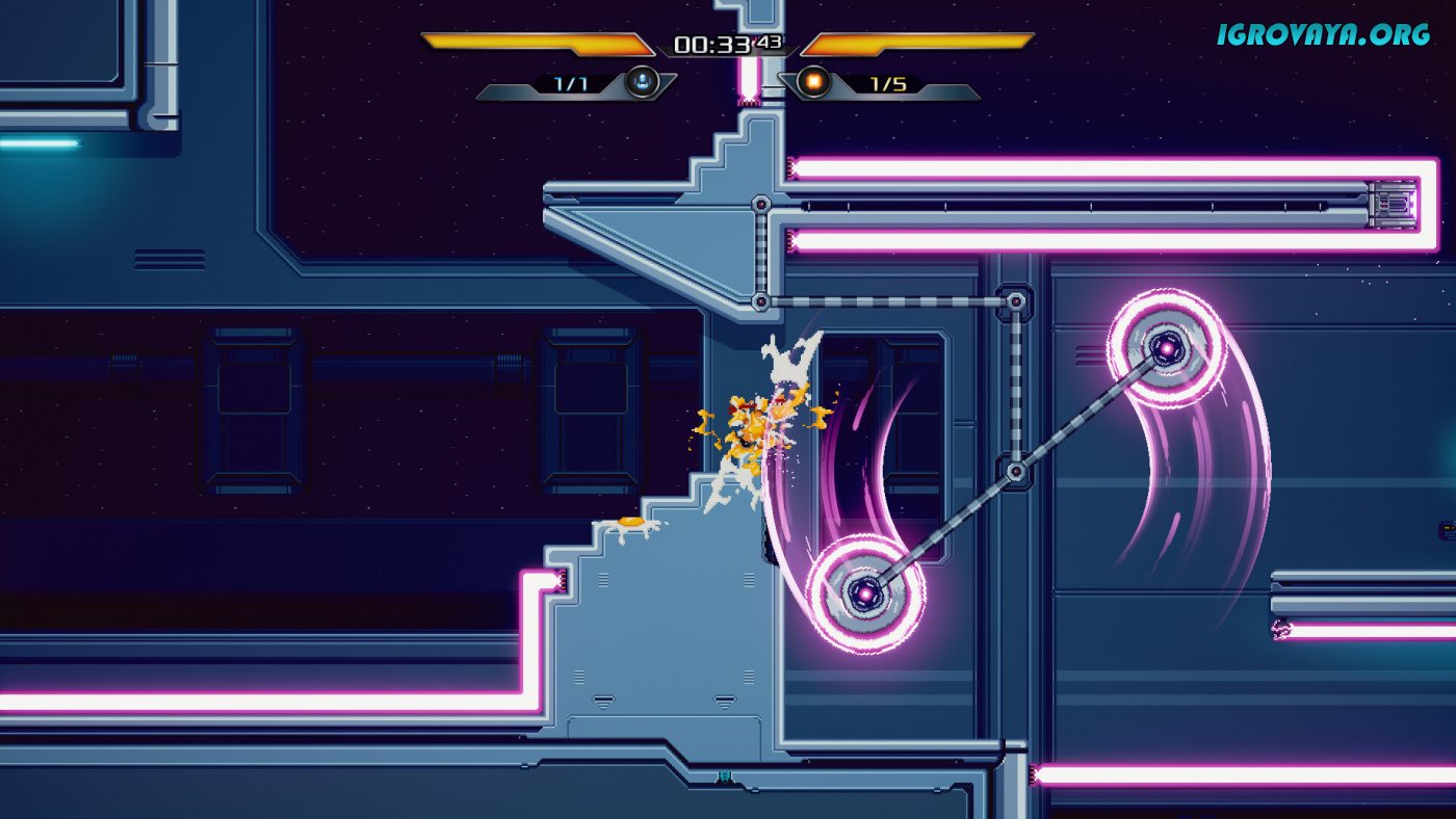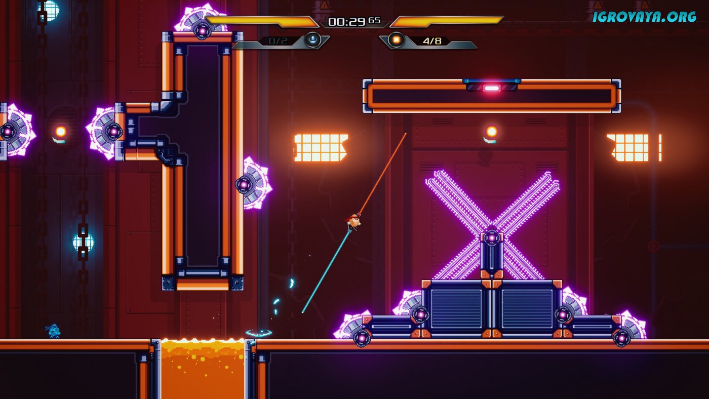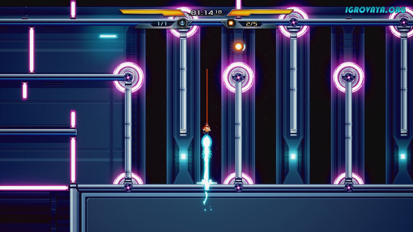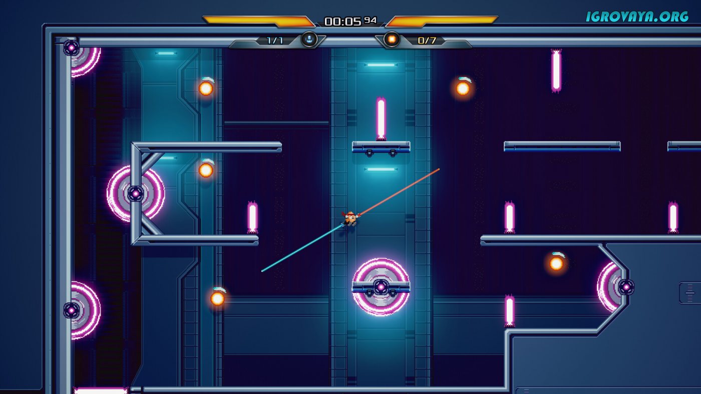 Уникальная механика с первых минут затянет и не позволит заскучать за счет постоянно растущего уровня сложности. В Turbo Shell вам придется освоить необычное для своего жанра управление, ведь главный герой обладает двумя лучами, оранжевым и синим. Первый позволяет притягиваться к стенам в то время, как второй — отталкиваться от них и при этом набирать скорость. На первых порах механика будет ощущаться непривычно, но дайте ей шанс, чтобы стать настоящим профессионалом.