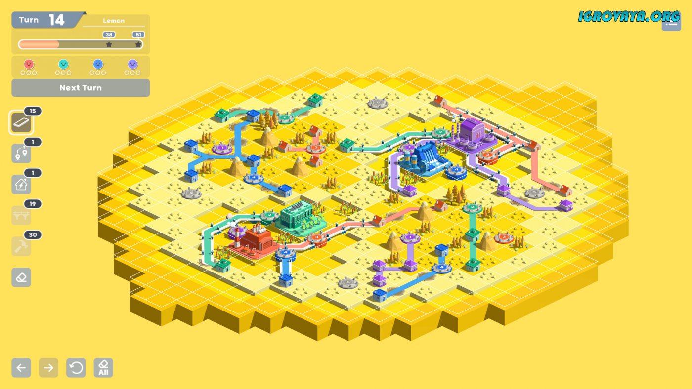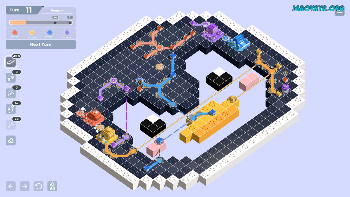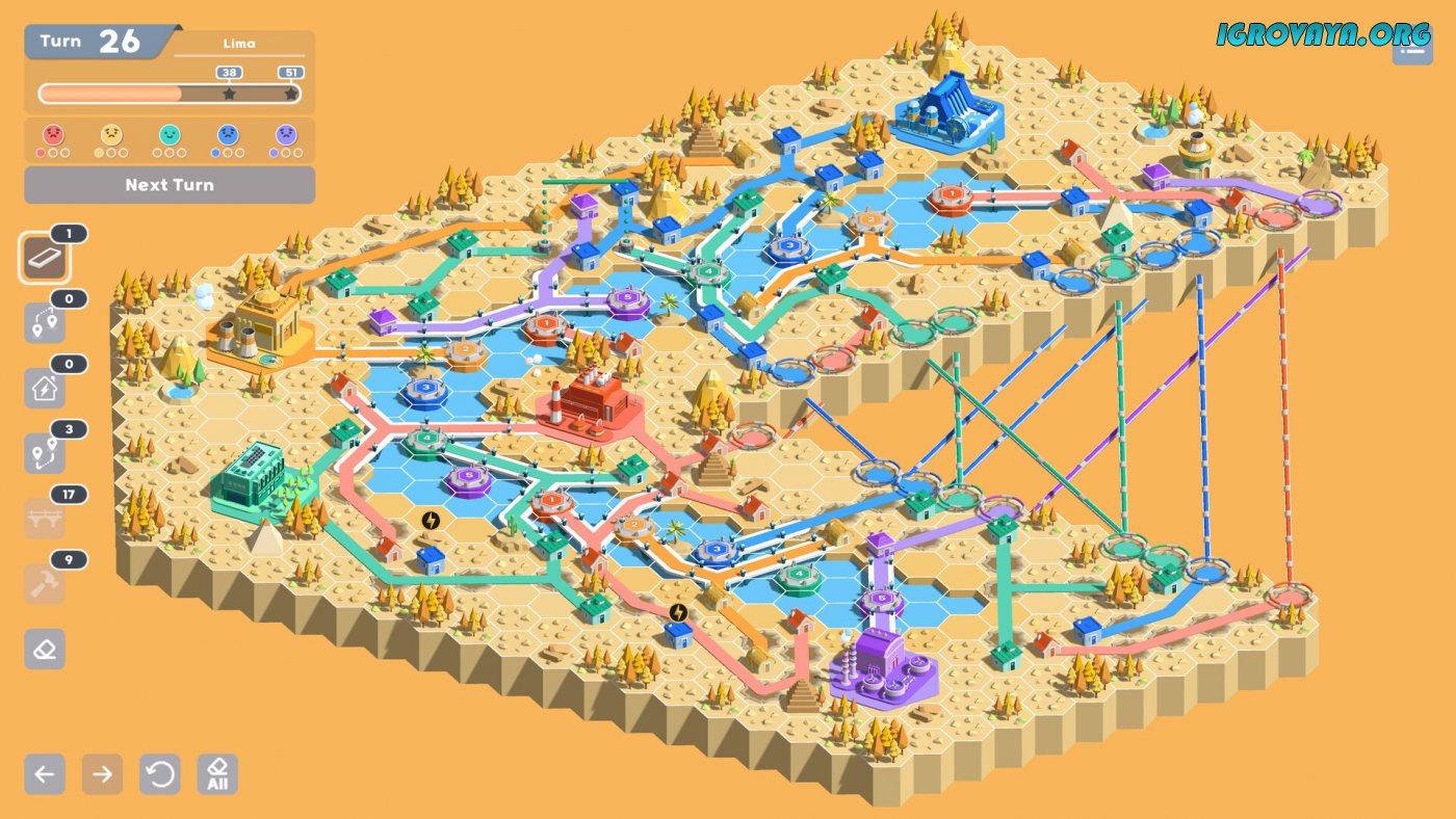Игровой процесс сам по себе достаточно прост: соединяйте электростанции с домами одинакового цвета и прокладывайте пути. Иногда потребуется искать обходные способы, а со временем и вовсе будут появляться новые способы достигнуть цели. Помните, что на каждом уровне существует несколько вариантов решения, поэтому экспериментируйте, ищите наиболее оптимальные варианты и получайте наслаждение от самого процесса. У нас вы можете скачать Can't Live Without Electricity торрент последнюю версию бесплатно на компьютер.