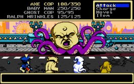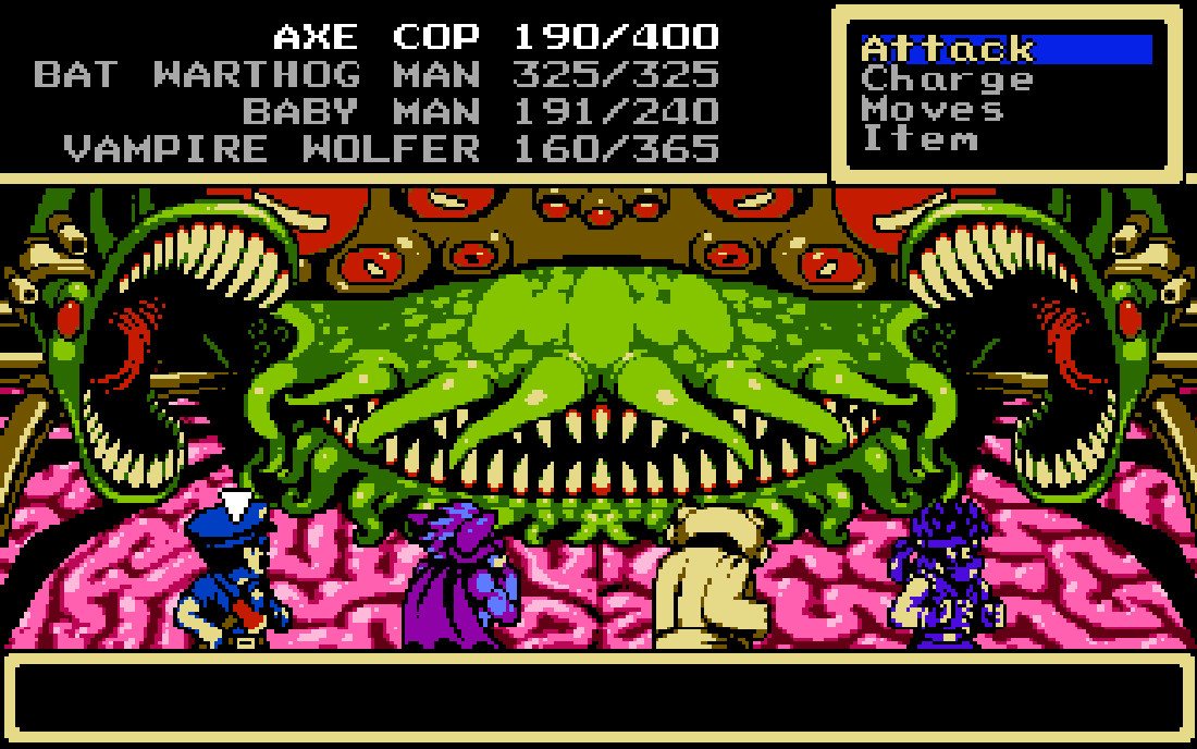 Axe Cop — это пиксельная ролевая игра в ретро-стилистике с пошаговым геймплеем. Погрузитесь в опасный мир, где обитает вооруженный топором Коп и его команда верных друзей, которые то и дело, что борются со злом. Вам предстоит пройти множество испытаний и сразиться с по-настоящему плохими парнями по типу Двойника Санта-Клауса, Доктора Вонючки, Ду-Ду и многими другими, поэтому самое время запастись оружием и выдвинуться в путь.