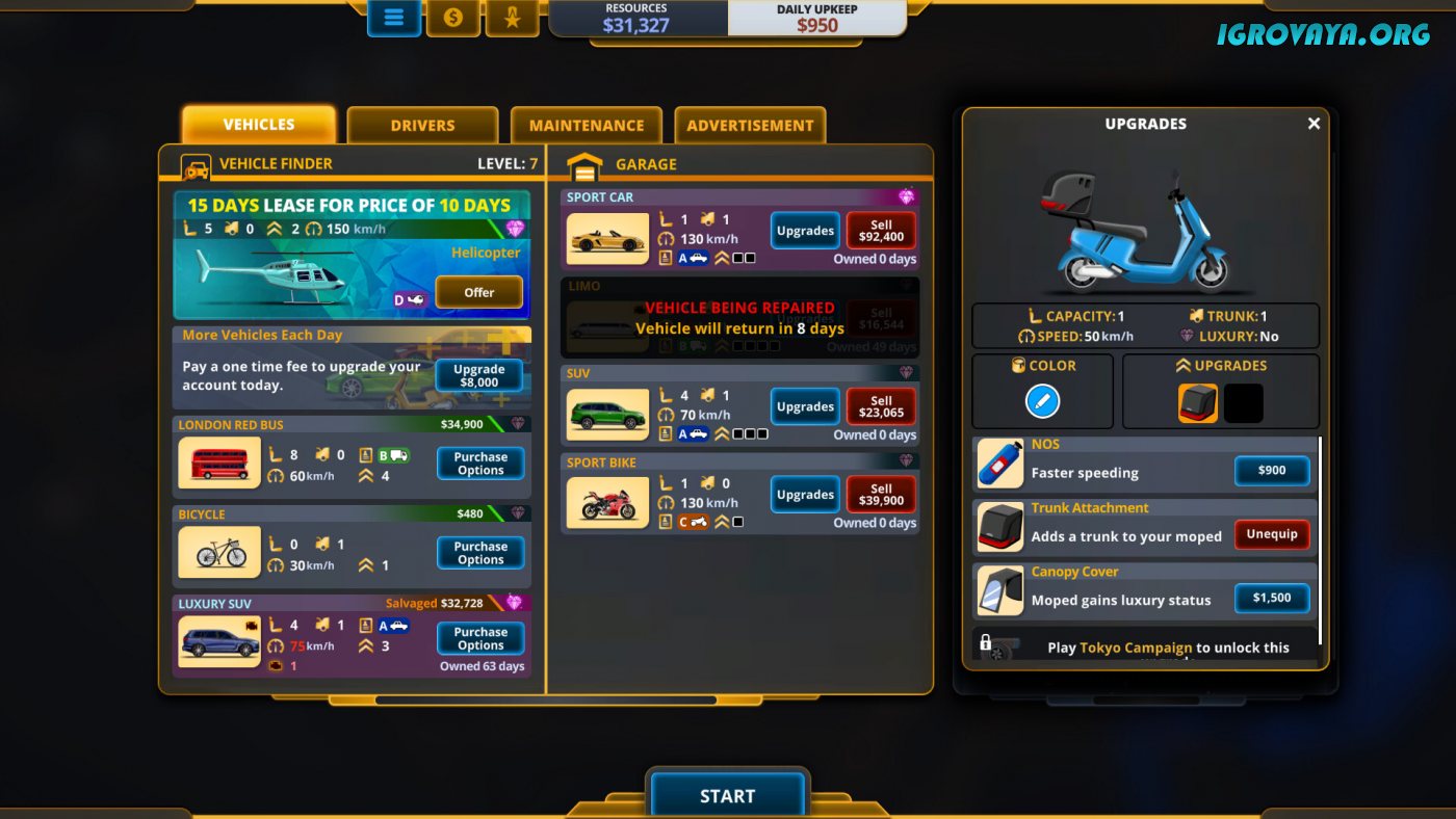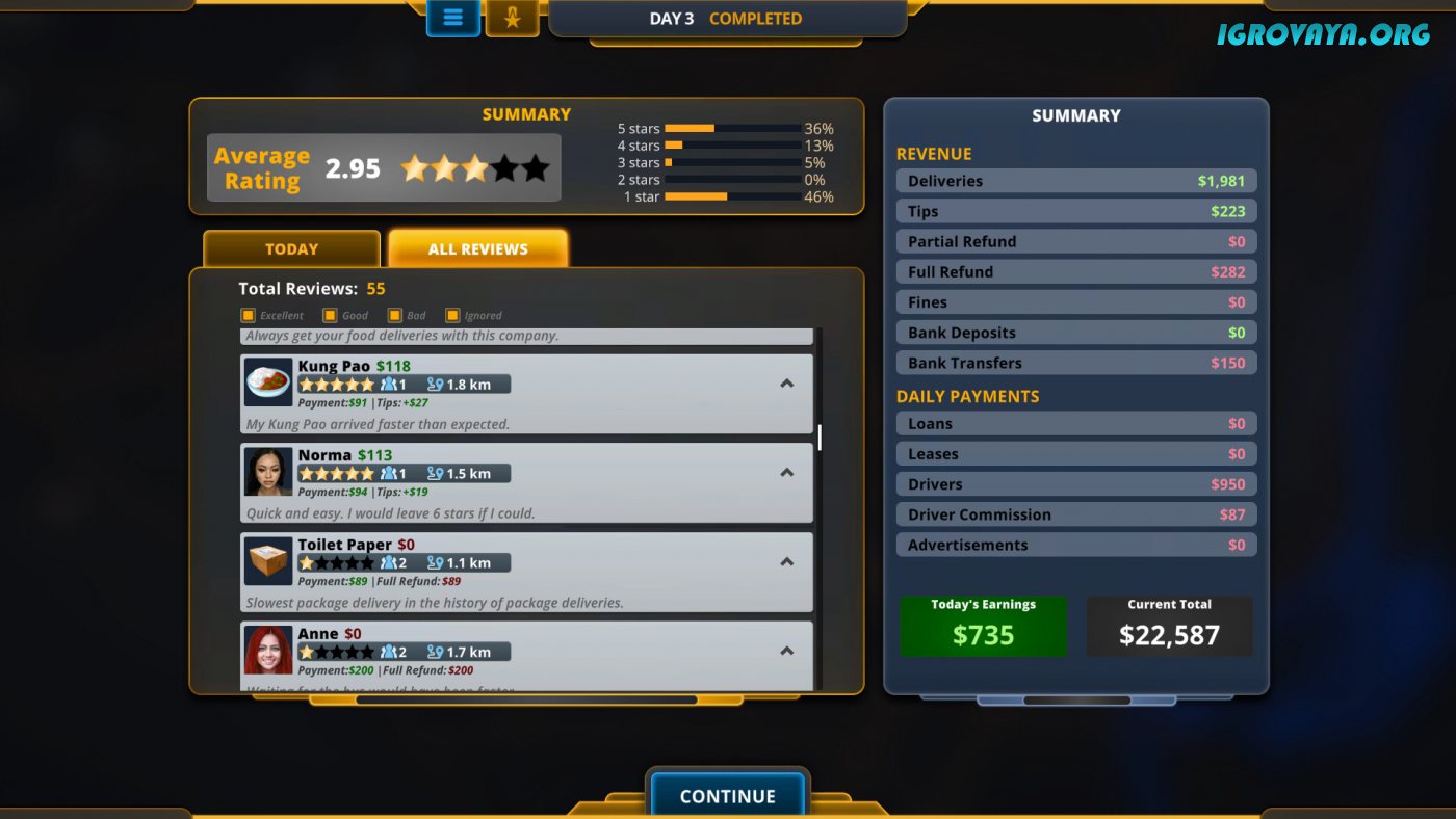 Увлекательный геймплей приглянется всем любителям данного жанра за счет своего разнообразия и многофункциональности. В Delivery INC у игроков буквально не будет свободной минуты на то, чтобы перевести дух, ведь на экране то и дело происходят самые разные события. В основе игрового процесса лежит доставка самых разных грузов, начиная от посылок и заканчивая работой такси. Ключевой особенностью стало то, что вам предстоит разработать наиболее выгодный маршрут, а для этого придется быстро оценивать ситуацию на дорогах и особенности клиентов. Не забывайте в конце дня подсчитывать заработанные средства и вкладываться в обновление автопарка, а также в найм новых сотрудников, чтобы повысить свою эффективность и подготовиться к наплыву потенциальных заказчиков.