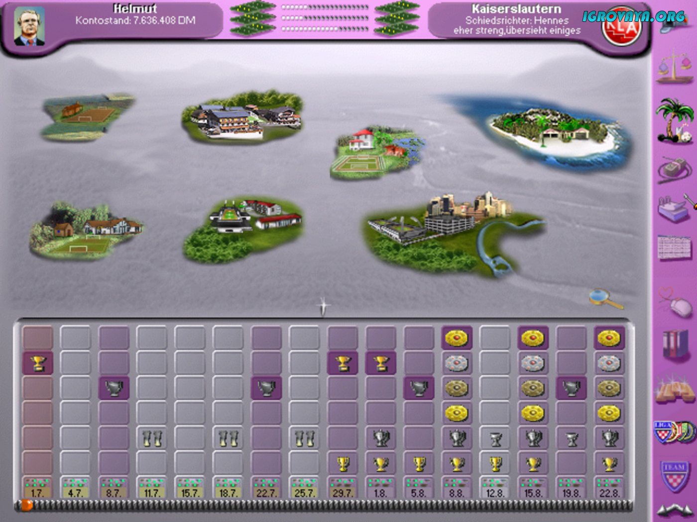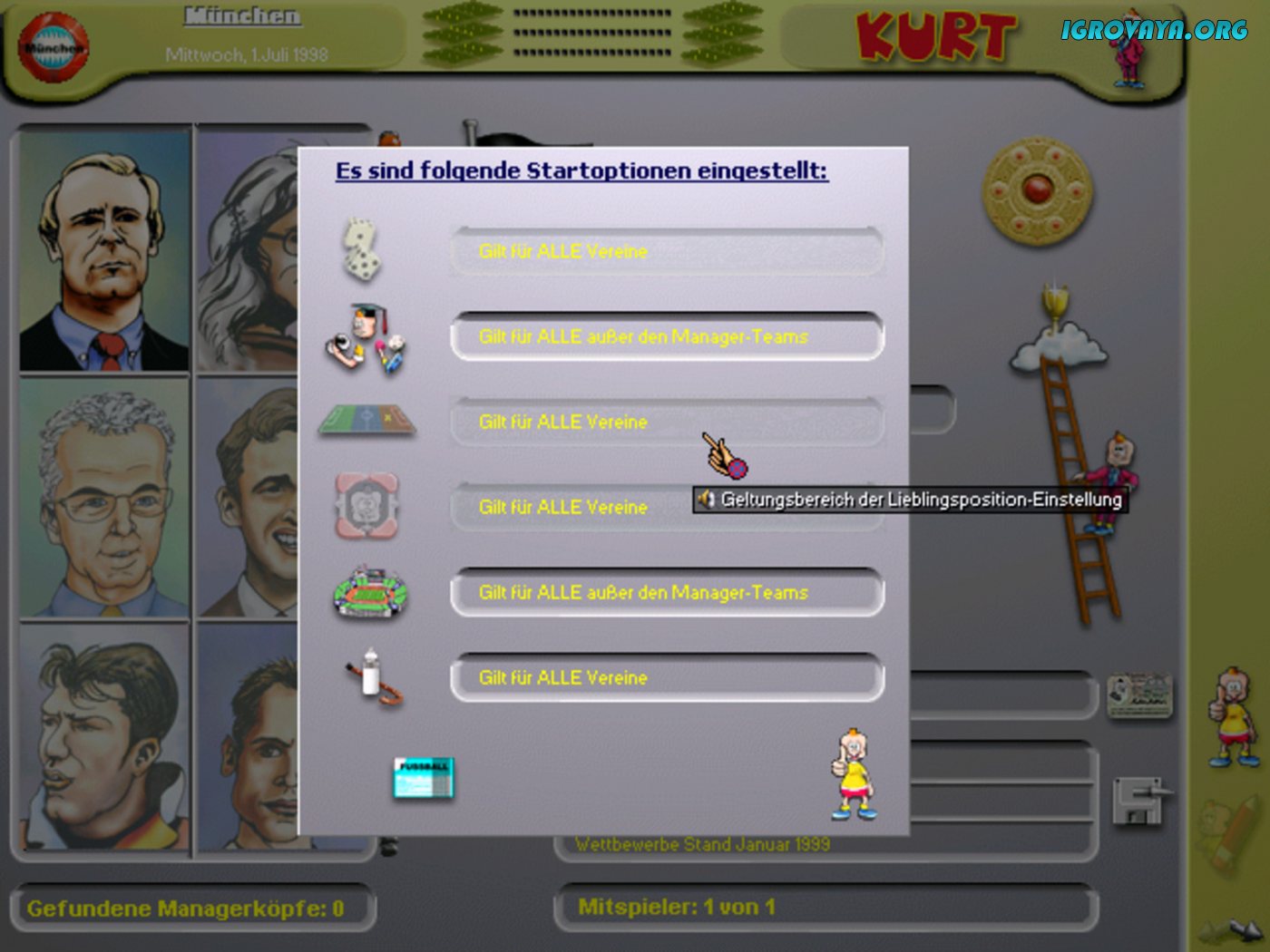 KURT DER FUSSBALLMANAGER — это один из первых реалистичных футбольных симуляторов вышедший аж в далеком 1999 году. Вам предстоит возглавить футбольную сборную в качестве менеджера и сделать все возможное для того, чтобы привести ее к победе в очередном чемпионате и завоевать мировое лидерство. Для этого потребуется создать подробный план тренировок, отыскать лучших спортсменов и пробиться на вершину списков победителей.
