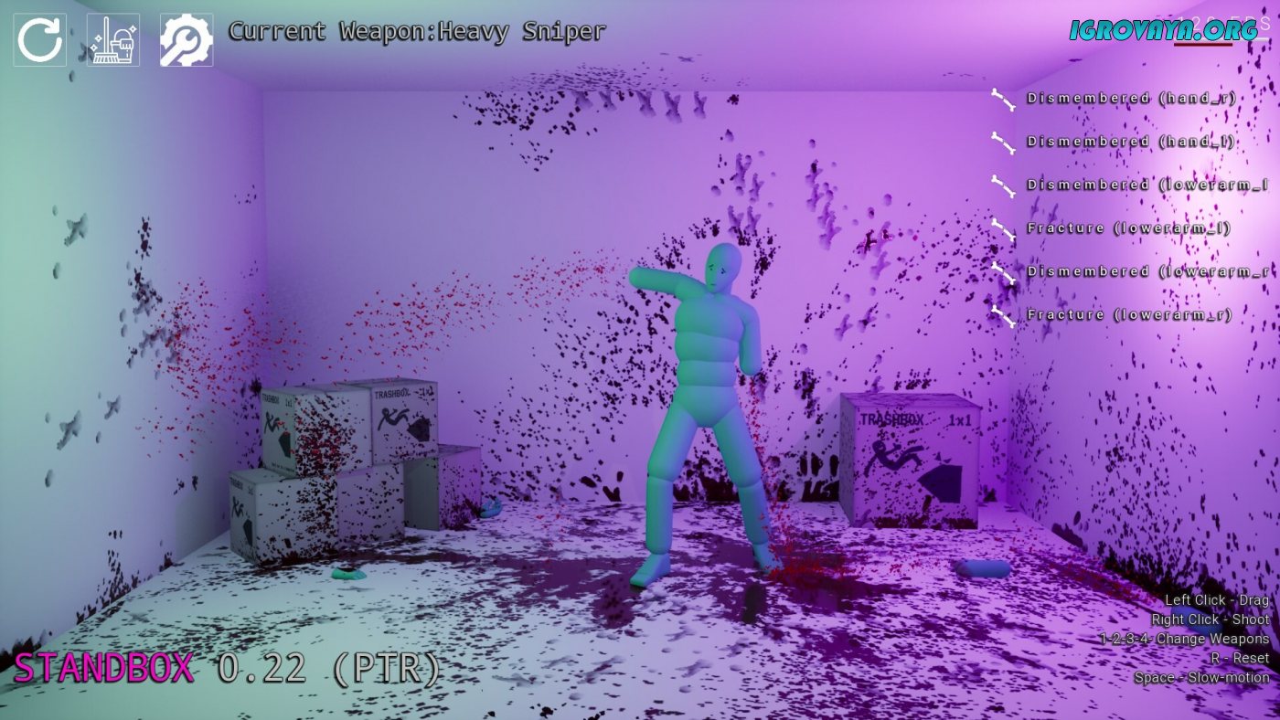 Строение действующего лица приближено к человеческому, а это значит, что у него есть полноценная кровеносная система и внутренние органы. В ходе испытаний вы в силах повредить его или же и наблюдать за тем, как из него вываливается содержимое и выплескивается кровь. У нас вы можете скачать STANDBOX торрент последнюю версию бесплатно на компьютер.