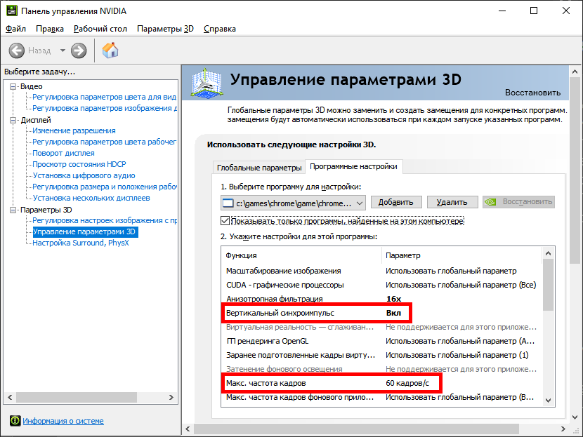 RivaTuner. Нажимаем кнопку Add, идем в папку с установленной игрой и выбираем ChromeSingle.exe. Справа выставляем Framerate Limit в 60.