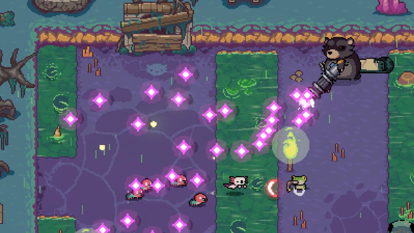 Геймплей — это классический twin-stick шутер с элементами roguelite: вы выбираете путь через комнаты с разными наградами, подбираете оружие (от катаны до гранатомёта) и комбинируете усиления, которые могут превратить ваш ствол в адскую машину смерти. Но главная фишка — это система выращивания аксолотлей. Каждый спасённый малыш попадает в ваш питомник, где его нужно кормить особыми блюдами (тут есть кулинарные мини-игры), чтобы он вырос в бойца с уникальными способностями. Хотите танка с щитом или убийцу с телепортом? Всё зависит от меню!