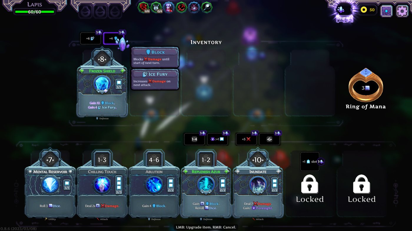 Каждый бой — это тактическая головоломка. Вы бросаете кости, а затем распределяете результаты между заклинаниями: одним нужно чётное число, другим — определённый диапазон значений. Некоторые карты позволяют перебрасывать кубики, дублировать результаты или даже жертвовать ими для мощных эффектов. Особый кайф — собирать синергии между артефактами (постоянными бонусами) и ритуалами (накапливаемыми способностями), которые могут перевернуть ход битвы.