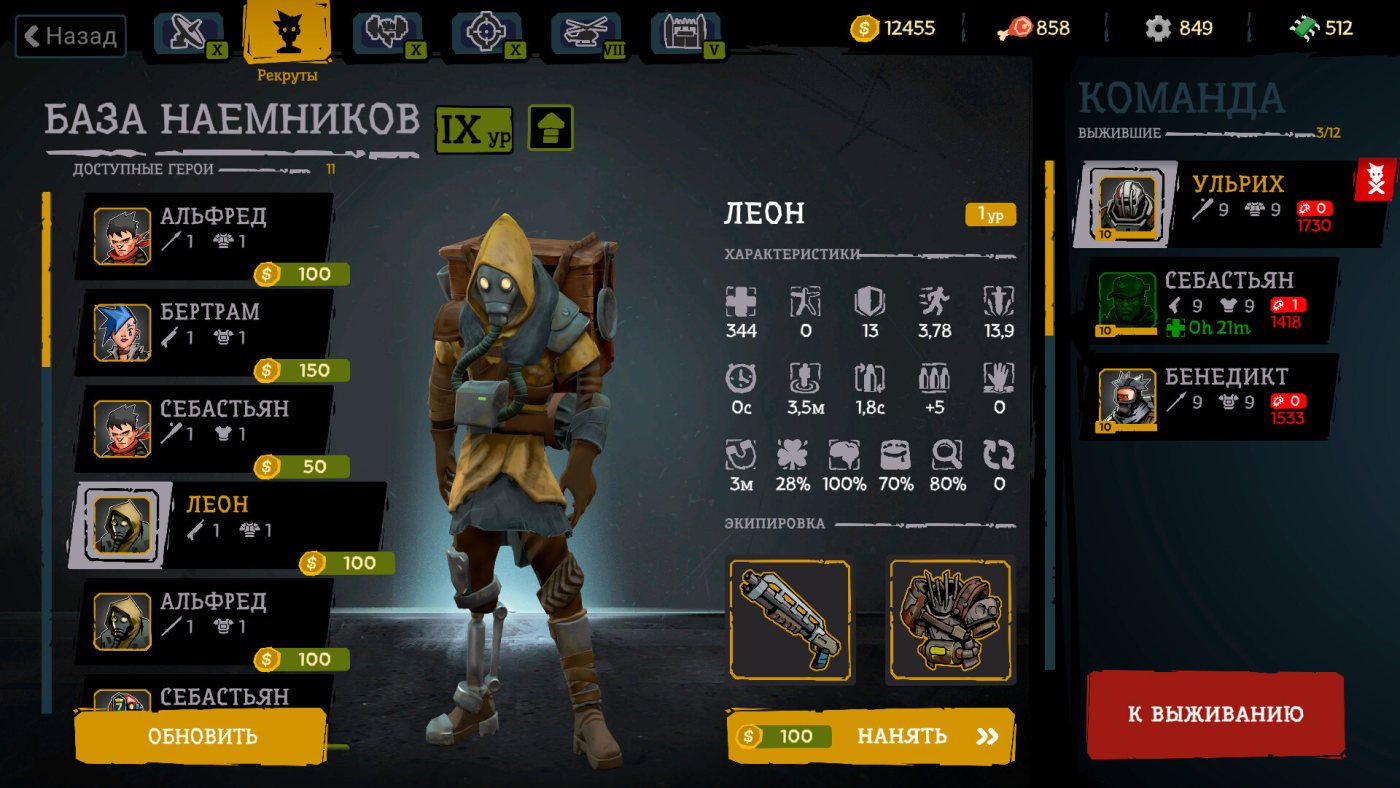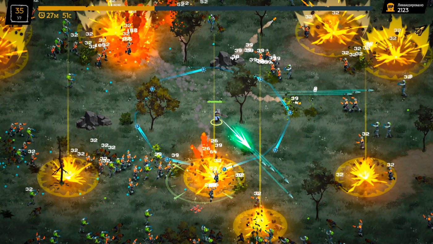 Начинаете с простого оружия — пистолет или дробовик, — но по ходу можно найти что-то покруче, вроде пулемёта или гранат. Всё это добро ещё и улучшается: добавляете шипы на дубину или молнии к пушке. Бои тут автоматические, вы только бегаете и собираете опыт, а стреляет само. Врагов куча — от мелких шустриков до здоровых боссов, что плюются или взрываются. Ещё и вирус в вас копится: чем дольше бежите, тем больше шансов словить мутацию — то силу даст, то здоровье отберёт. Лагерь — ваша база: там качаете бойцов, чините шмотки и строите бараки, чтобы шансы выжить росли.
