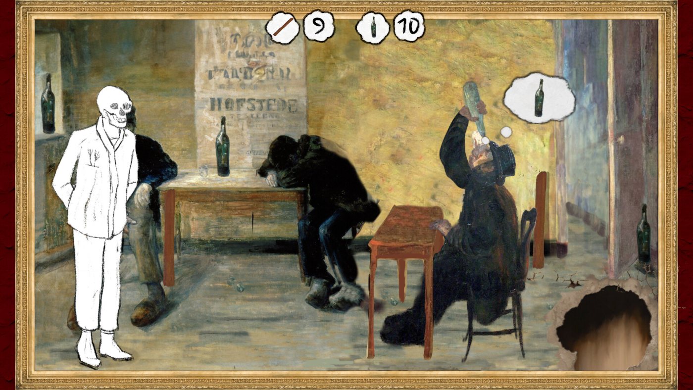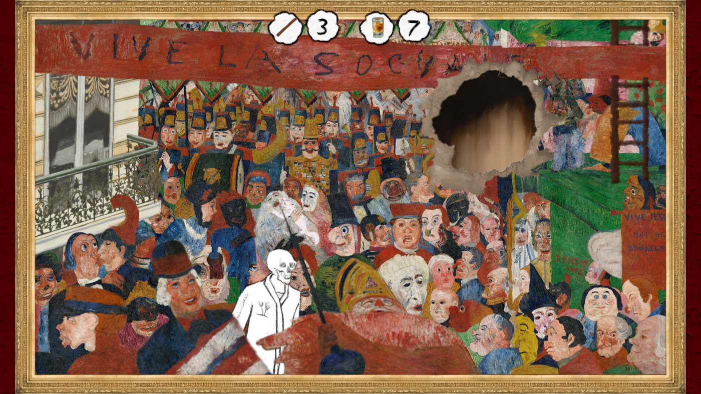 Геймплей балансирует между медитативным и озорным. Одни задания заставят чинить разрывы на холстах, аккуратно восстанавливая контуры, другие — искать спрятанные в соседних работах предметы: от курительных трубок до... отрезанных усов. Особый шарм — в анимации: вот скелет в цилиндре неуклюже гребёт в лодке, а вот застолье внезапно оживает храпом одного из гостей. Звуки то дополняют атмосферу (шум толпы, скрип дверей), то сводят с ума — например, чавканье «Пожирателя устриц» лучше отключить в настройках.