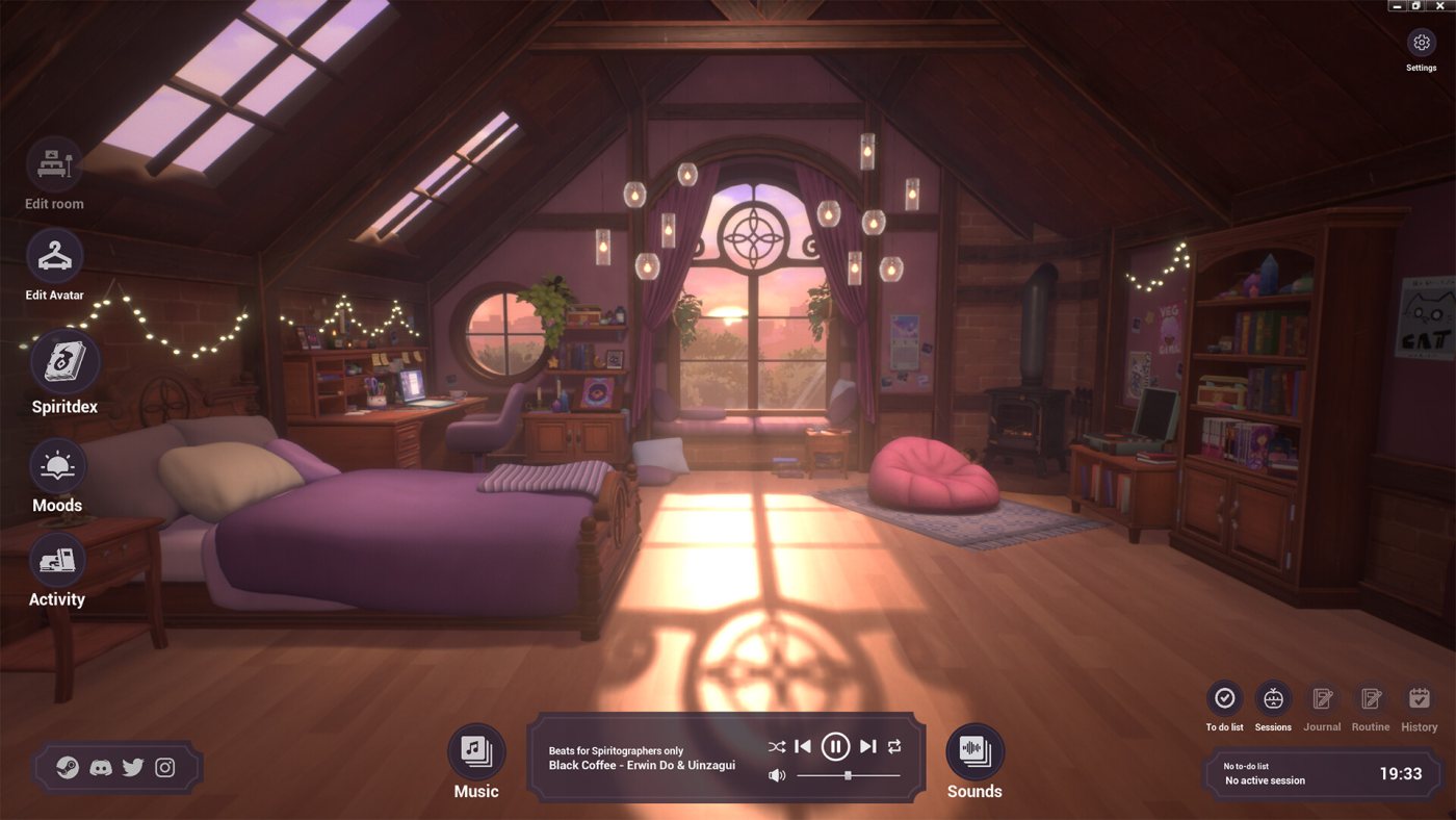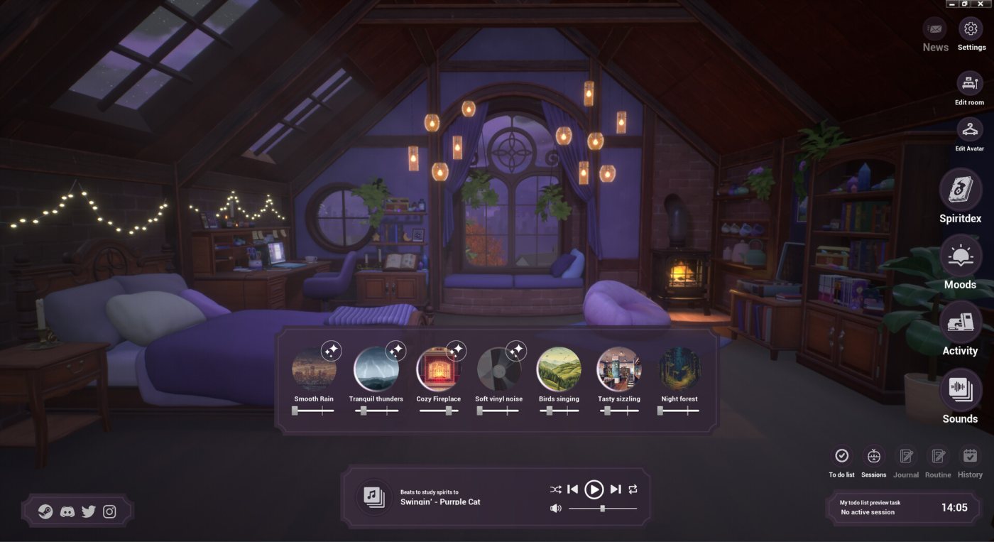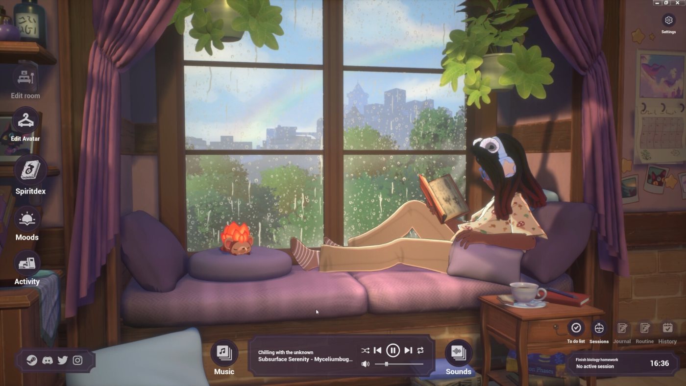 Геймплей тут ненавязчивый: вы настраиваете атмосферу, выбираете, чем заняться – читать, вязать или просто смотреть в окно, – а потом оставляете игру фоном, пока работаете или учитесь. Есть таймер для сосредоточенной работы, список дел, где можно отмечать задачи, и даже журнал для мыслей – всё простое, но удобное. За выполнение задач начисляют опыт и билеты, которые тратите на новые шторы, пледы или цвета для своих духов. Визуал мягкий, в пастельных тонах, с плавными анимациями, а звуки – от пения птиц до треска винила – складываются в личный ASMR-микс, который можно подогнать под себя через встроенный веб-плеер.