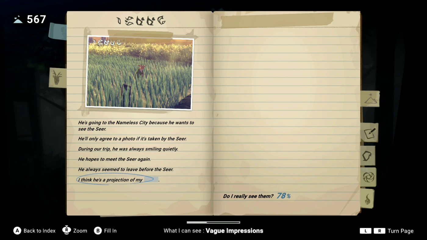 В пути вы встретите девушку без памяти — её присутствие привносит в повествование неожиданные повороты. Ваш альянс с ней строится не на диалогах с готовыми вариантами ответов, а на общих действиях и выборе того, что (и как) вы решите запечатлеть. Духи гор — от призрачных оленей до говорящих птиц — реагируют на фотографии, и от того, какими они получатся, зависит, удастся ли вам разгадать их истинные желания. Тут нет боев или четких указаний куда идти, только атмосфера медленного, но глубокого погружения в историю.