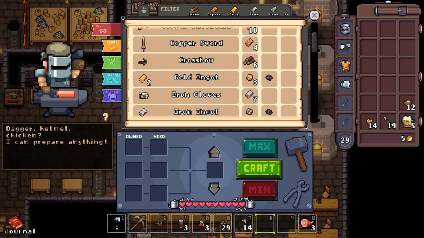 Перед спуском вы выбираете три задания — добыть ресурсы, убить монстров или найти артефакты. Без выполнения хотя бы одного вас не выпустят обратно: придётся вызывать эвакуационный бур и отбиваться от орд тварей, пока идёт обратный отсчёт. Смерть означает потерю всего инвентаря, но умные гномы запасаются — банк хранит слитки металлов, а на золото можно купить базовую экипировку у торговца-гоблина. Глубины пещер: внизу ждут механические двери, требующие шестерёнок, и древние алтари, раздающие магические перки вроде «взрывного чиха» или ауры, поджаривающей врагов.