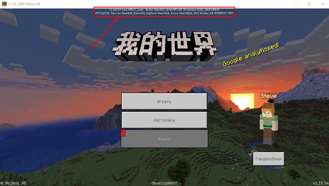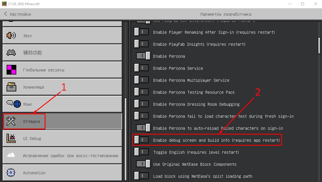 5. Чтобы убрать Экран отладки (первый скрин), заходим в Настройки/Отладка (№1 на втором скрине) и переводим ползунок влево напротив "Enable debug screen..." (№2 на втором скрине), далее перезапускаем игру, чтобы изменения вступили в силу.
