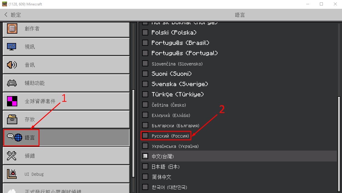 4. После первого запуска язык будет китайский. Чтобы перейти на русский, в главном меню нажимаем вторую кнопку (первый скрин), далее в левом меню листаем вниз и нажимаем кнопку с синим шаром (№1 на втором скрине), далее ставим галку напротив "Русский" (№2 на втором скрине).