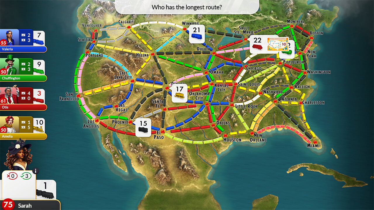 На старте всё просто: собираете карты вагонов — красные, синие, жёлтые — и тянете маршрут, например, от Чикаго до Денвера за пару очков. Потом втягиваетесь: длинные пути вроде Сиэтл—Майами дают больше, но требуют целую гору карт. Билеты добавляют перца: соедините Бостон с Хьюстоном, и вам бонус, а не выйдет — очки улетят в минус. Карта живёт в 3D: поезда катят по рельсам, станции мигают, а вы играете либо с умным ИИ, либо с друзьями онлайн — до пяти человек в одном матче. Ещё есть Европа в дополнении — с туннелями и паромами, где без локомотивов не обойтись.