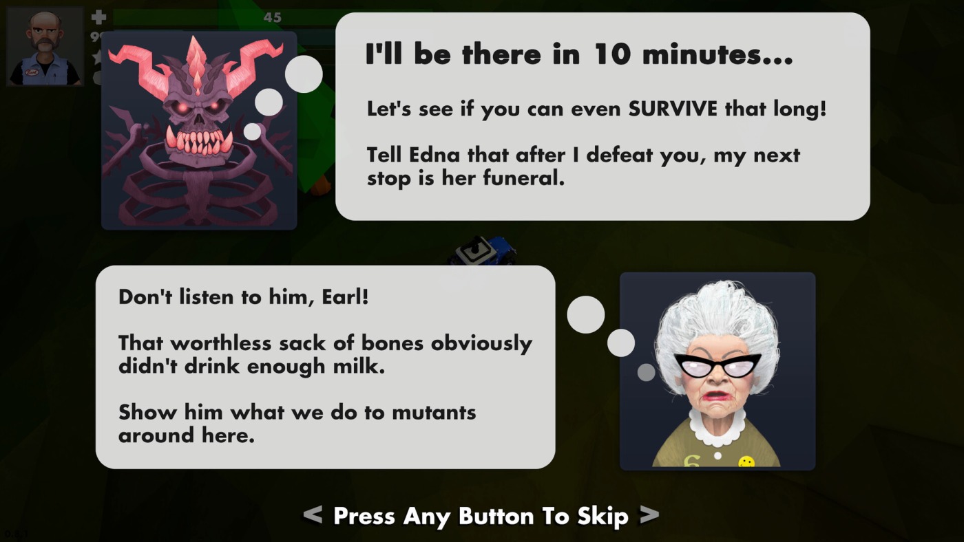 Earl vs. the Mutants — рогалик для любителей динамичных перестрелок в постапокалиптическом мире. Ядерный апокалипсис застал всех врасплох и превратил затронутых радиацией людей в орды ходячих мертвецов. Предприимчивая Эдна в чьих руках находился бизнес по борьбе с вредителями решает быстро переквалифицироваться под современные реалии и избавить мир от распространившейся заразы, а поможет ей в этом обладатель 37-ми наград работника месяца Эрл.