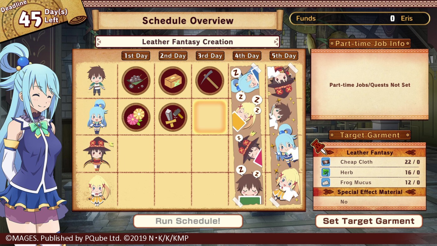 На что вы пойдете, чтобы снять проклятье? KONOSUBA предлагает весьма затягивающий игровой процесс в ходе которого вы не только будете читать интерактивный роман, влияя на развитие сюжета через принятые решения, но и играть в мини-игры, где придется комбинировать различные ингредиенты для создания костюмов. Но вы не подумайте: так действительно нужно, чтобы разблокировать новые реплики и задания, а также продвинуться по сюжету.
