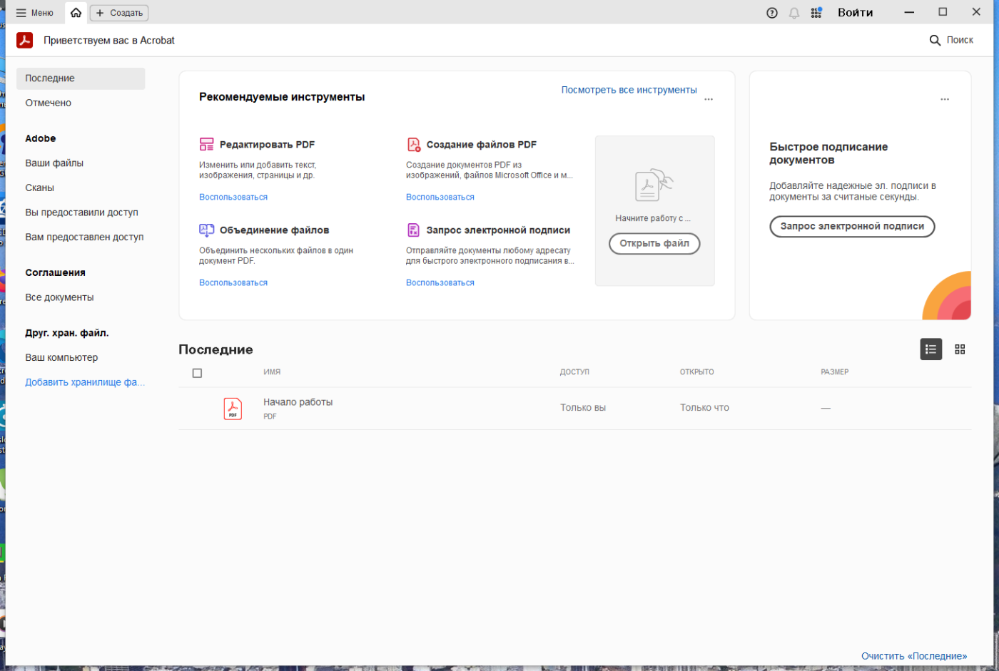 Адоб Акробат Про 2024 полностью обновлена и представляет собой усовершенствованную версию своих собратьев. Разработчики оставили встроенное обучение, которое встретит вас при первом запуске и ознакомит со всеми необходимыми функциями. Сразу бросается в глаза улучшенная рабочая зона благодаря переносу всех необходимых инструментов в верхнюю панель, а также и тот факт, что данная версия Adobe Acrobat Pro содержит в себе поддержку облачного хранилища, которое можно связать с мобильным устройством и иметь доступ к файлам из любой точки мира.
