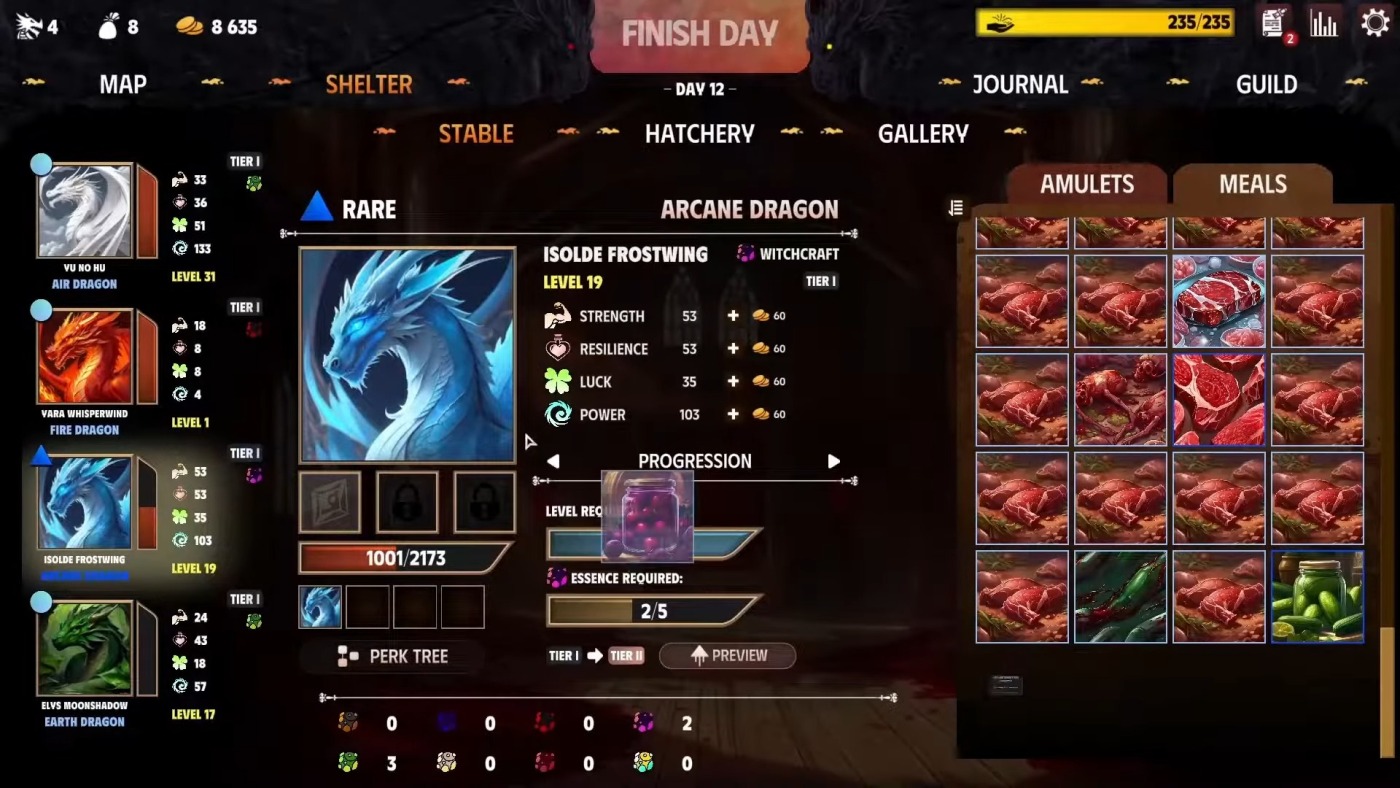 Увеличивайте мощь своих драконов, снабжая их новыми амулетами, которых в игре более 50. Модернизируйте амулеты у кузнеца, вкладывайте заработанное в драконов, но делайте это с умом, ведь вам необходимо максимизировать свою прибыль. Выводите драконов и расширяйте их количество, отправляйте их в экспедиции, где они будут сражаться с другими драконами и добывать себе пищу, а также новые предметы.