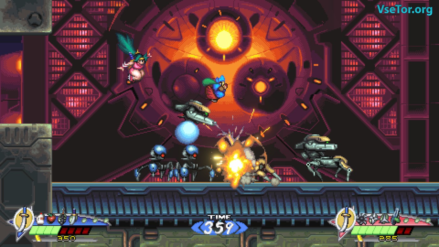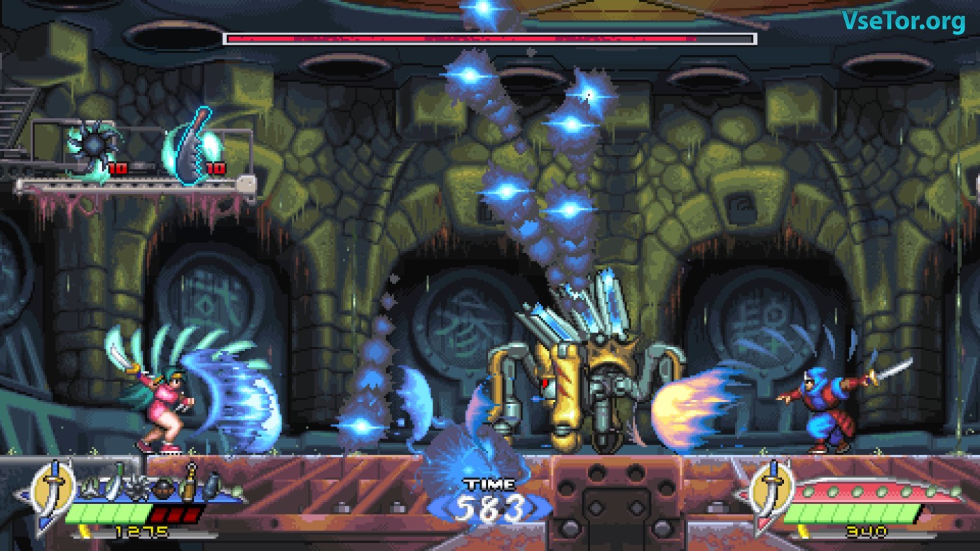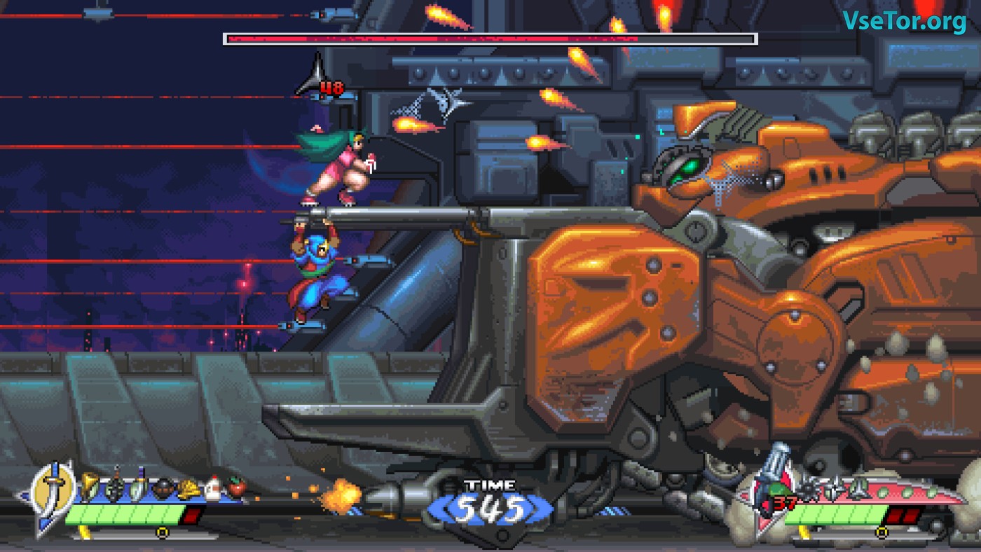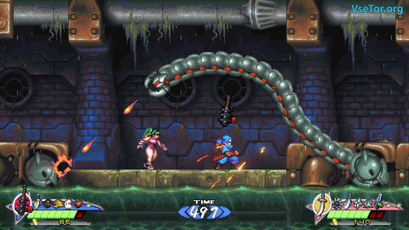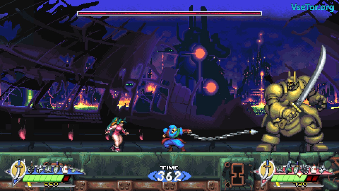 Геймплей — классический платформер с упором на ближний бой и тактику. У вас два основных оружия: меч (быстрый, с дальними атаками при апгрейде) и кунай с цепью (медленный, но позволяющий бить под разными углами). Разница между ними не просто косметическая: цепь можно использовать для точечных ударов из укрытия, а меч — для отражения снарядов. Добавьте к этому второстепенные предметы (сюрикены, калитроны) и паркур-механики (стенолаз, зависание в прыжке), и получите глубокий, но интуитивный экшен. Правда, управление местами чувствуется «тяжёлым» — прыжки требуют разгона, а переключение предметов в реальном времени может сбивать с толку. Визуально игра — шедевр пиксель-арта. Фоны детализированы, анимация плавная, а враги и боссы выглядят впечатляюще. Музыка в стиле синтвейв отлично передаёт атмосферу киберпанк-ночного города. У нас вы можете скачать Shadow of the Ninja - Reborn торрент последнюю версию бесплатно на компьютер.