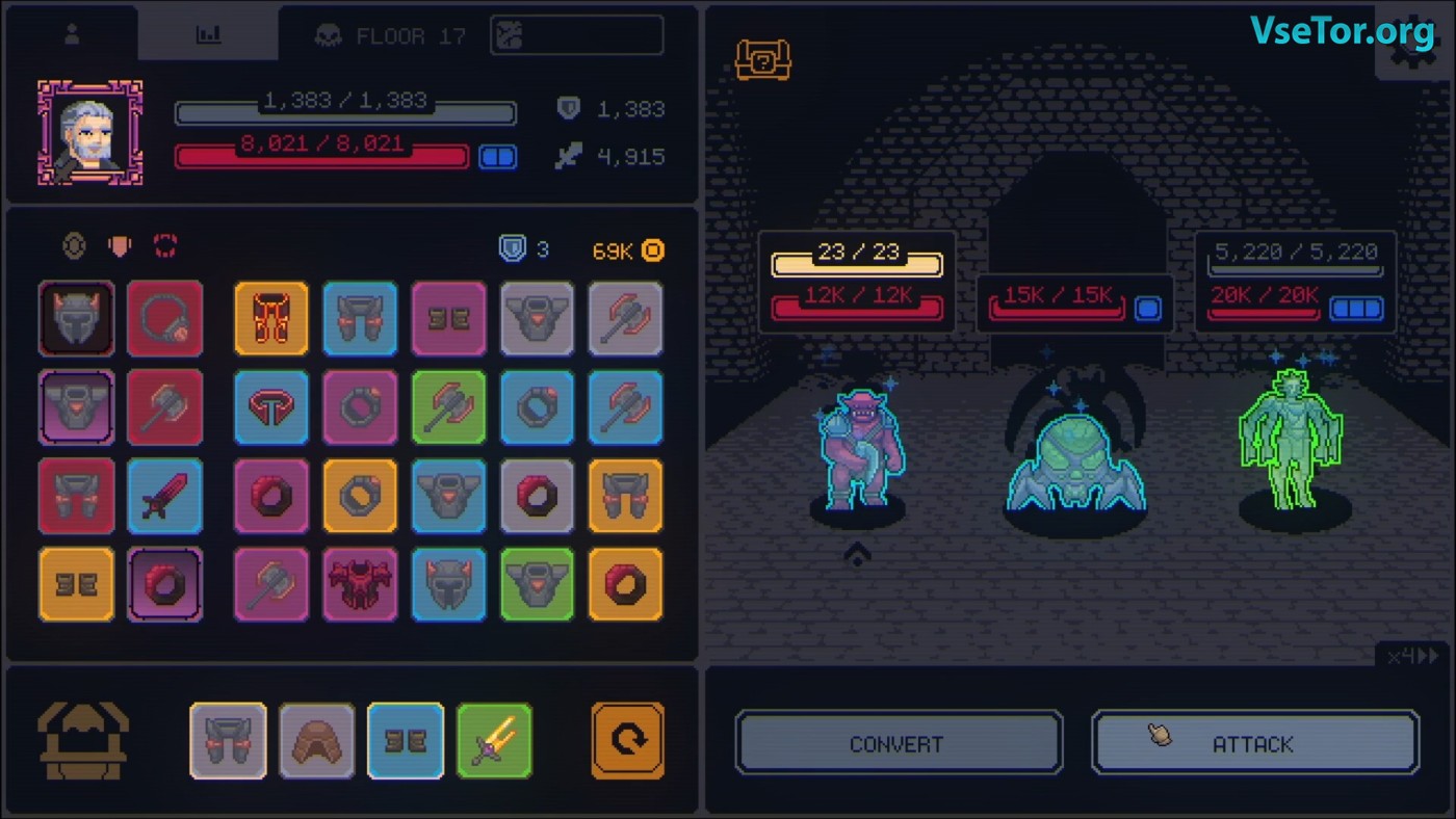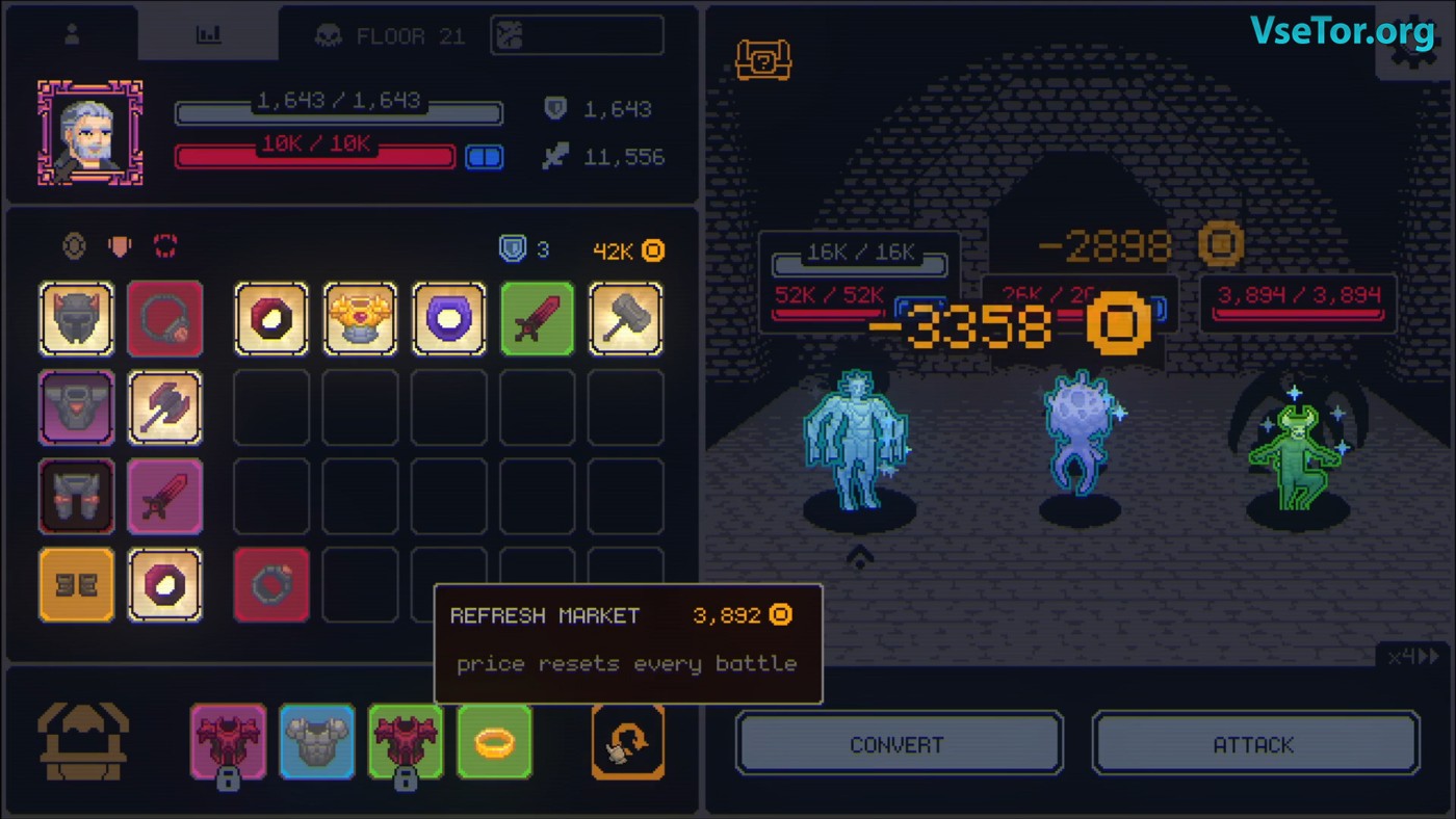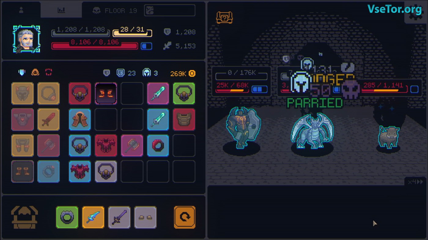 Megaloot – уникальный гибрид рогалика и инвентарного тетриса, где каждая новая атака начинается с оптимизации вашего снаряжения. Игра сразу захватывает своей простой, но гениальной концепцией: на одном экране разворачиваются пошаговые сражения в стиле ретро-RPG, а на другом – ваш постоянно открытый инвентарь, требующий постоянного внимания. Вот где начинается самое интересное: каждое найденное снаряжение – это не просто +5 к урону, а сложный выбор между немедленным использованием, комбинированием для апгрейда или разборкой на мгновенные статы. Особый кайф – цепные реакции, когда несколько предметов одного типа последовательно улучшают друг друга прямо во время боя.