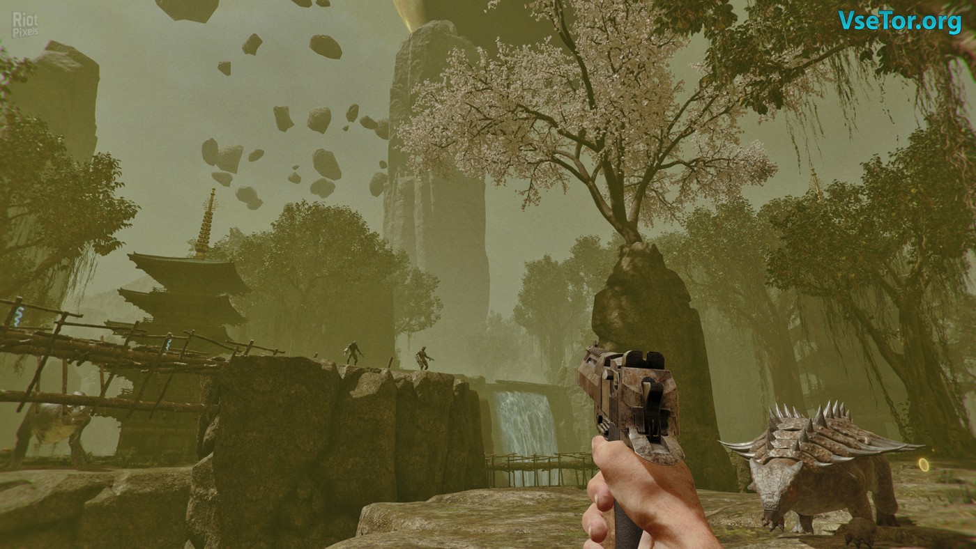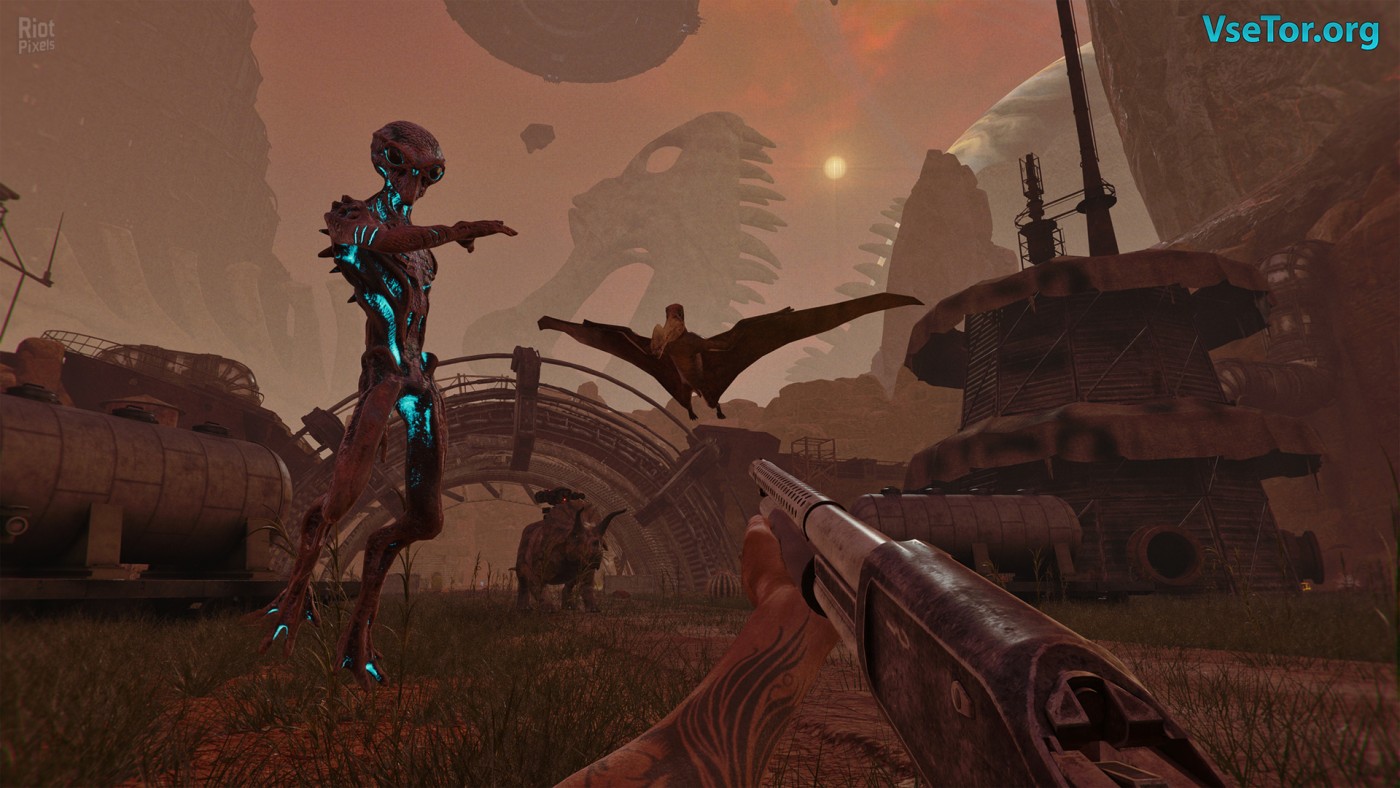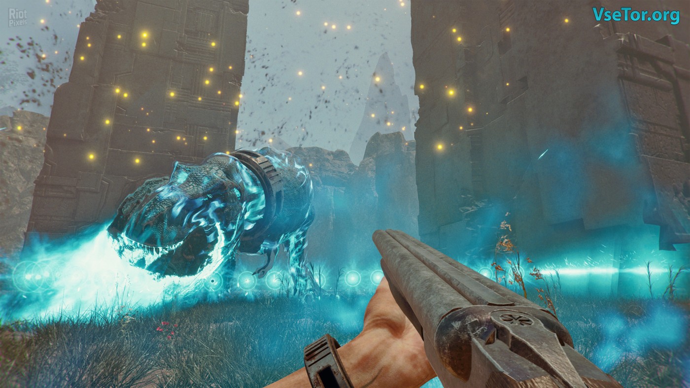 Son and Bone переносит вас в шкуру шерифа Сэма Джаджа, который в погоне за бандой преступников неожиданно оказывается в параллельном мире, кишащем динозаврами и доисторическими тварями. Это не просто очередной шутер — здесь есть что-то от старого доброго Turok, щепотка Doom Eternal с его «глори-киллами» и даже намёк на безумие Serious Sam. Вы будете прыгать, стрелять из десятков стволов (от кольтов до ракетниц) и разрывать врагов в клочья с помощью особых добиваний — «Судеб», которые выглядят так, будто их придумали на спор после просмотра «Парка Юрского периода».