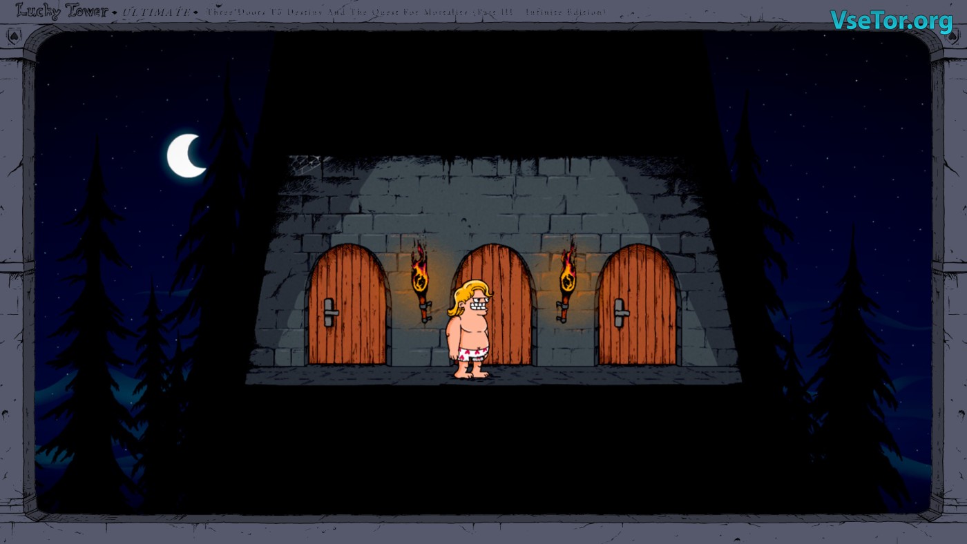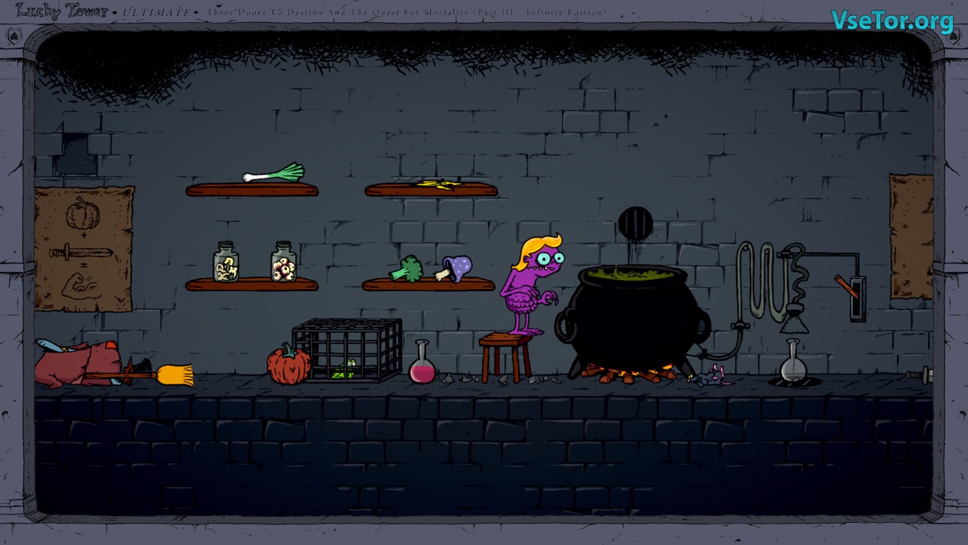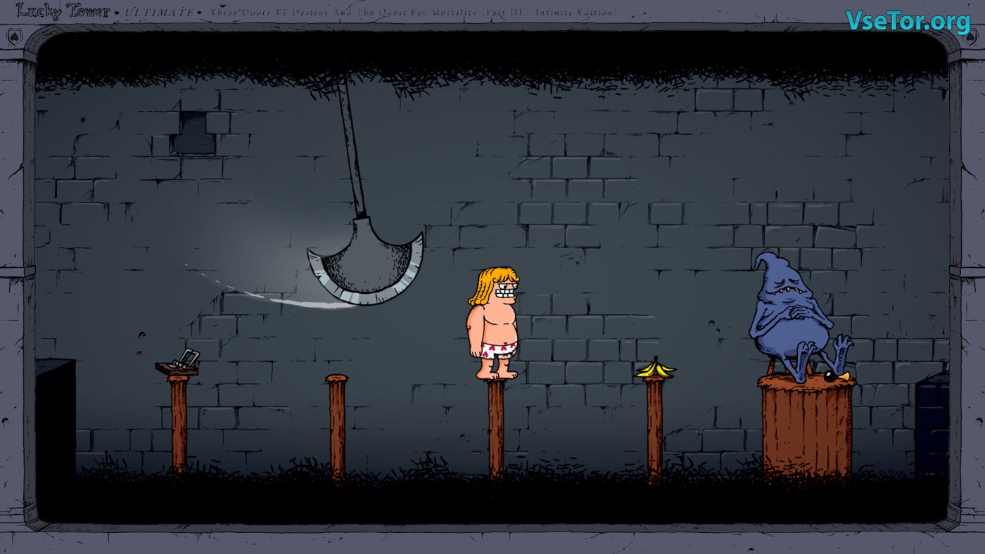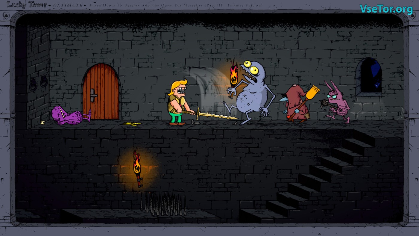 Представьте, что вы просыпаетесь в башне в одних трусах-сердечках, а вокруг — десятки дверей, за каждой из которых скрывается либо сокровище, либо смертельная ловушка. Lucky Tower Ultimate — это рогалик с элементами платформера, где ваш герой, хвастливый рыцарь Вон Ванст, раз за разом ныряет в хаотичные комнаты, полные абсурдных опасностей. То вас раздавит гигант с молотом, то убьёт разъярённый гоблин на унитазе, а то вы просто поскользнётесь на банановой кожуре — и это лишь малая часть сотен способов умереть в этой игре.