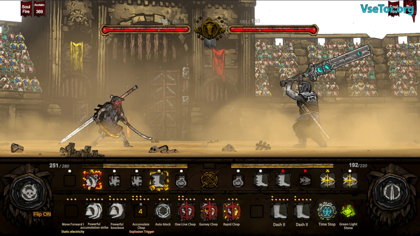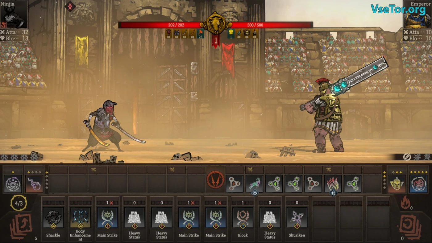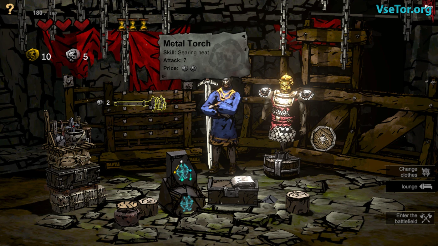 Каждый раз после драки вы подбираете шмотки — оружие, доспехи, новые карты. В игре их куча: больше 200 стволов — от топоров до луков — и почти сотня брони. Можно собрать комбо, чтобы, например, поджечь врага или пустить ему кровь. Есть семь разных наборов карт — хочешь руби напролом, хочешь стреляй издалека. Между аренами заглядываешь в лавки, где торгуют железом, и думаешь, как лучше подготовиться. Каждый бой — это мозги и нервы: рискнуть всем или переждать за щитом.