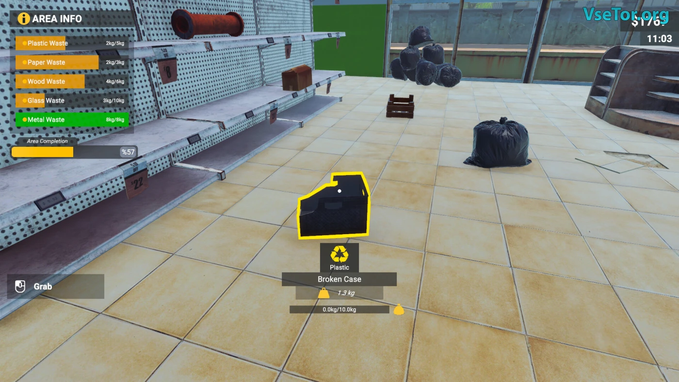 Геймплей построен на цикле: покупка партии мусора/сортировка/переработка/продажа товаров. Каждый этап требует внимания — торгуйтесь с поставщиками за лучшую цену, вручную разбирайте конвейерную ленту, наполняя цветные контейнеры стеклом, пластиком и металлом, а затем загружайте сырьё в специализированные станки. Например, измельчитель превращает макулатуру в картон, а плавильная печь создаёт металлические слитки. Деньги вкладывайте в новых сотрудников, автоматические линии или расширение территории.