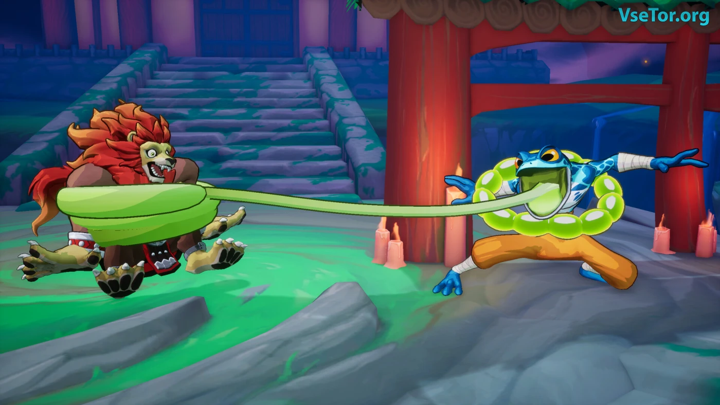 Арены — не просто фон, а полноценные участники схваток. Одна минута вы деретесь на залитой солнцем поляне, а следующая — под всполохами молний, когда у обоих игроков остаётся по одной жизни. Визуальный стиль, сочетающий чёткую 3D-графику с яркими 2D-эффектами, делает каждую атаку выразительной, а интерфейс — максимально читаемым даже в хаосе четырёхплеерной битвы. Отдельного упоминания заслуживает саундтрек: энергичные электронные треки идеально подходят для скоростных поединков.