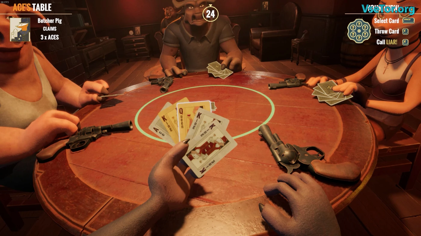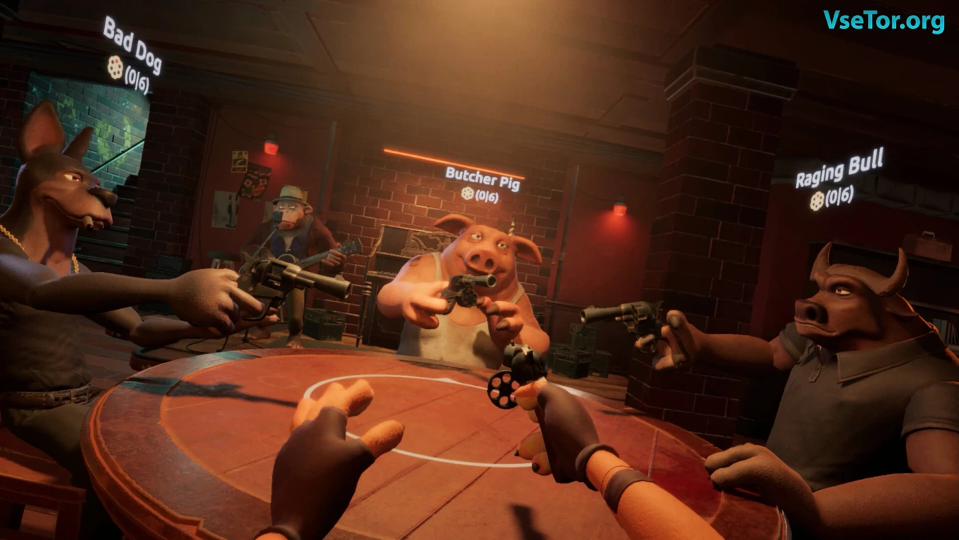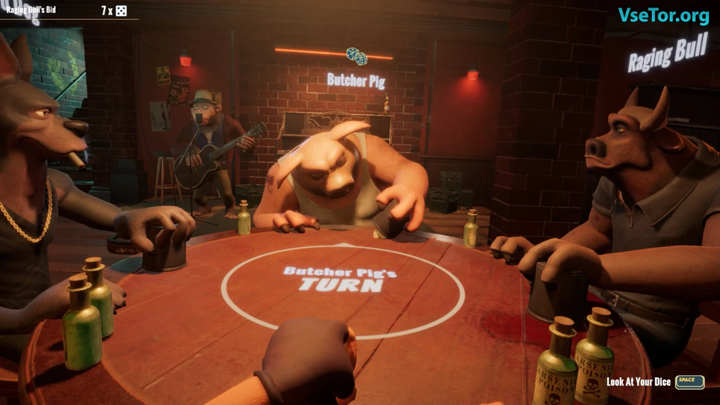 А наказание тут не шуточное. В "Liar's Deck" за враньё вам суют револьвер к виску – это русская рулетка, один шанс из шести, что пуля вылетит. Выжили – играете дальше, нет – до свидания. В "Liar's Dice" пьют яд: две бутылки, и вы вне игры. Персонажи – зверьё с характерами: бык с крутым нравом, лиса с хитрым взглядом, свин с татуировкой жены на груди. Они шевелят ушами, пялятся на вас, пока вы думаете, блефовать или нет.