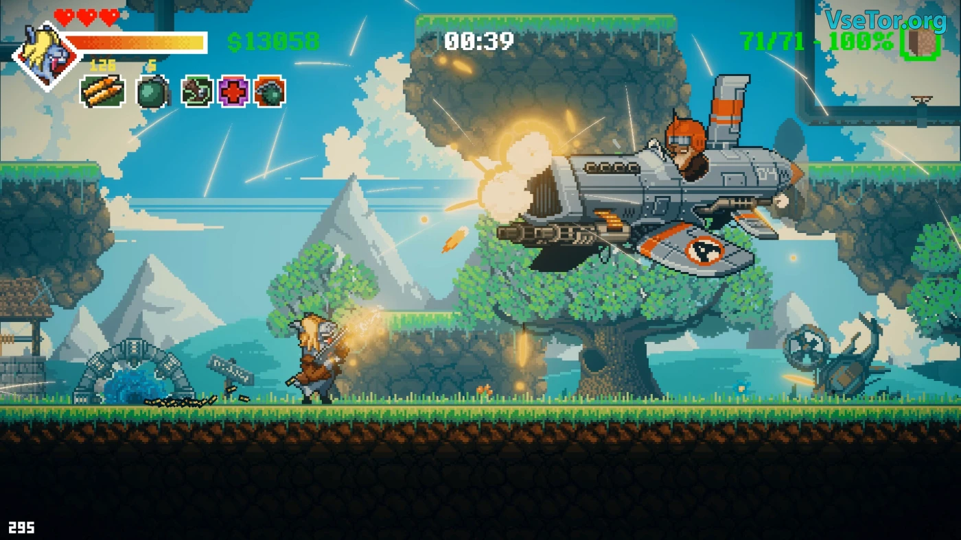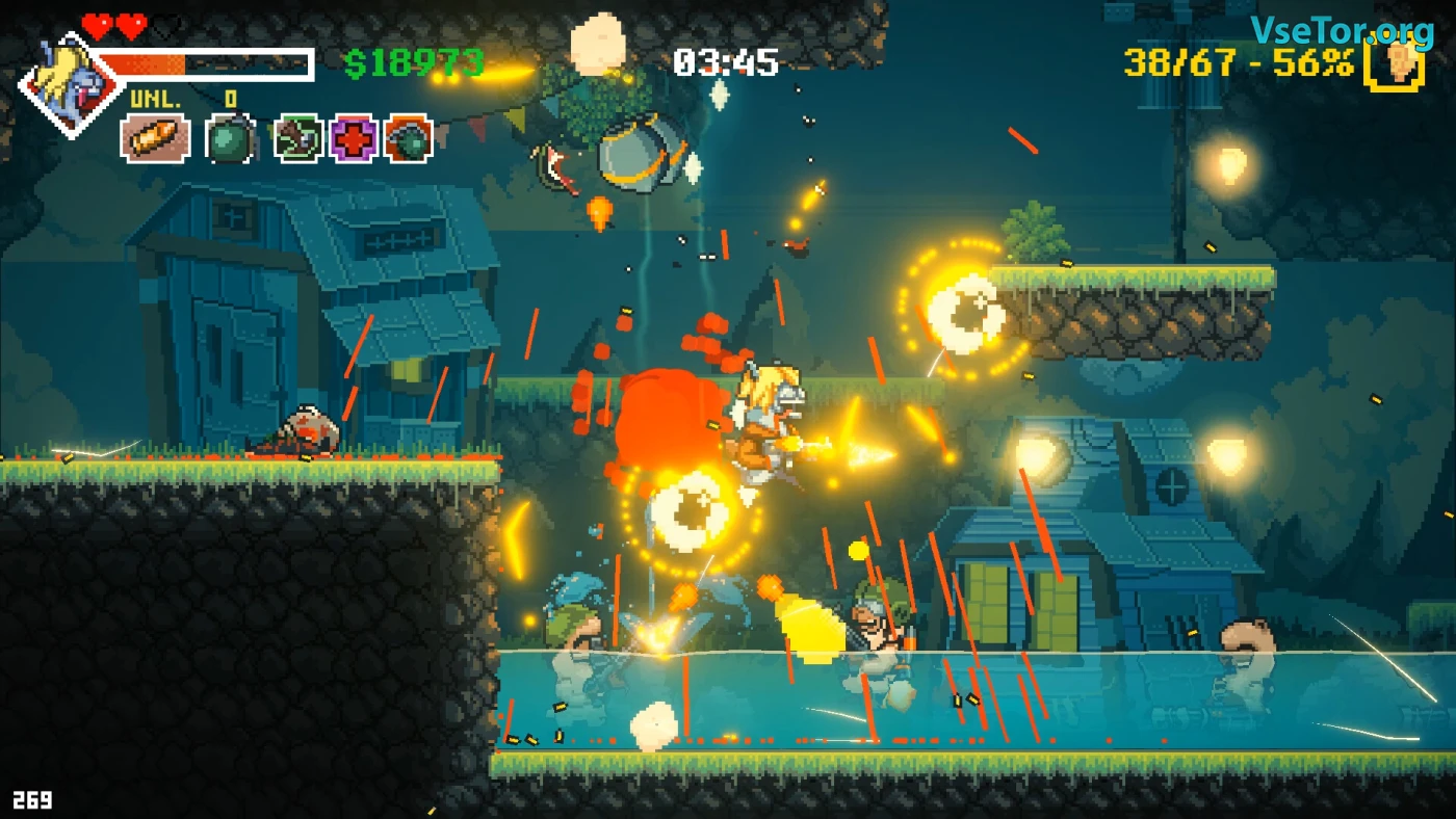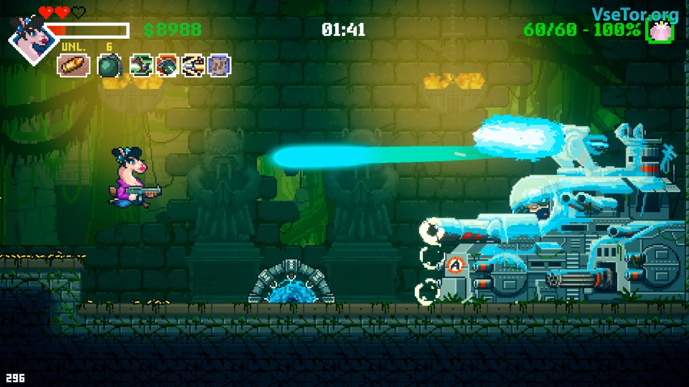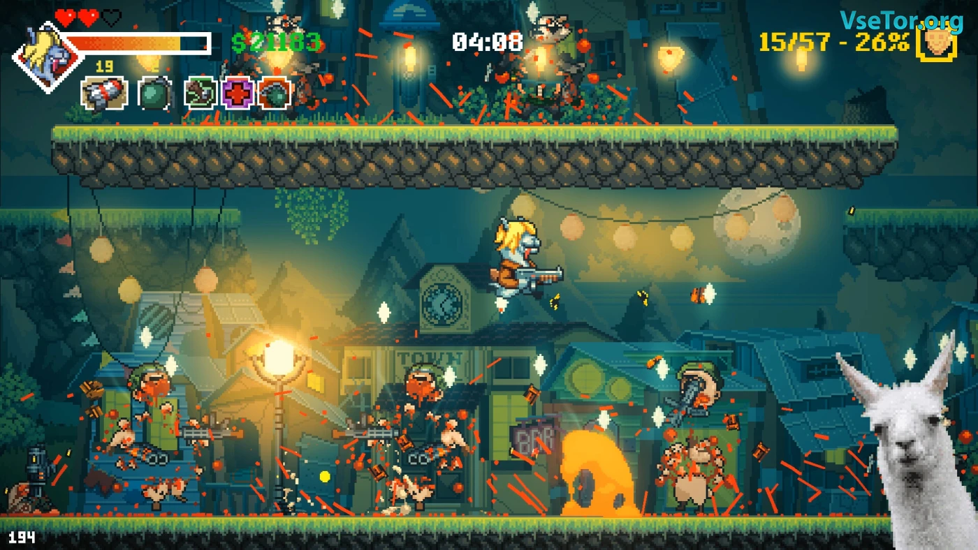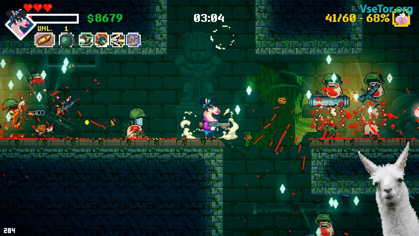 Уровни генерируются процедурно – каждый заход будет другим, хотя основная задача везде одна: собрать минимум 75% предметов, найти выход и успеть до обнуления пятиминутного таймера. Локации огромные, с вертикальными переходами, лазами по стенам и двойными прыжками – пригодится каждая капля навыков. Трое доступных лам различаются по характеристикам: кто-то стреляет мощнее, кто-то прыгает выше, но все они быстро бегают и стреляют в четыре стороны, как в классическом Contra. По ходу дела добываете монеты, меняете их на улучшения – больше здоровья, скорость, сила прыжка – и идёте дальше, к следующему боссу.