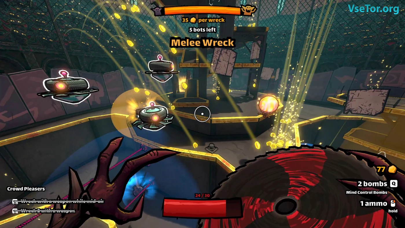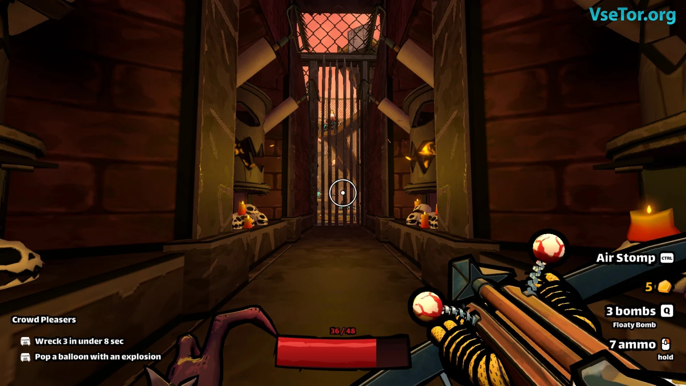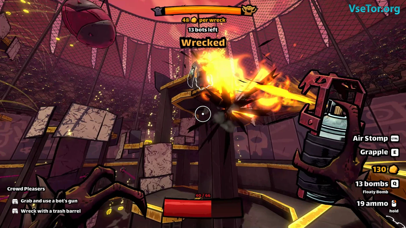Бегаете по стенам? Да. Хватаете врагов и кидаете их в других врагов? Конечно. Устраиваете фейерверк из взрывов, прыжков и летящих обломков? Это обязательная часть программы! Каждый забег уникален — арены генерируются, а ваш арсенал растёт от хаотичных метательных предметов до мощного оружия с безумными модификациями. Хотите арбалет, стреляющий одиннадцатью рикошетящими стрелами с взрывным зарядом? Без проблем, главное — угодить зрителям, ведь их восторг определяет вашу награду.